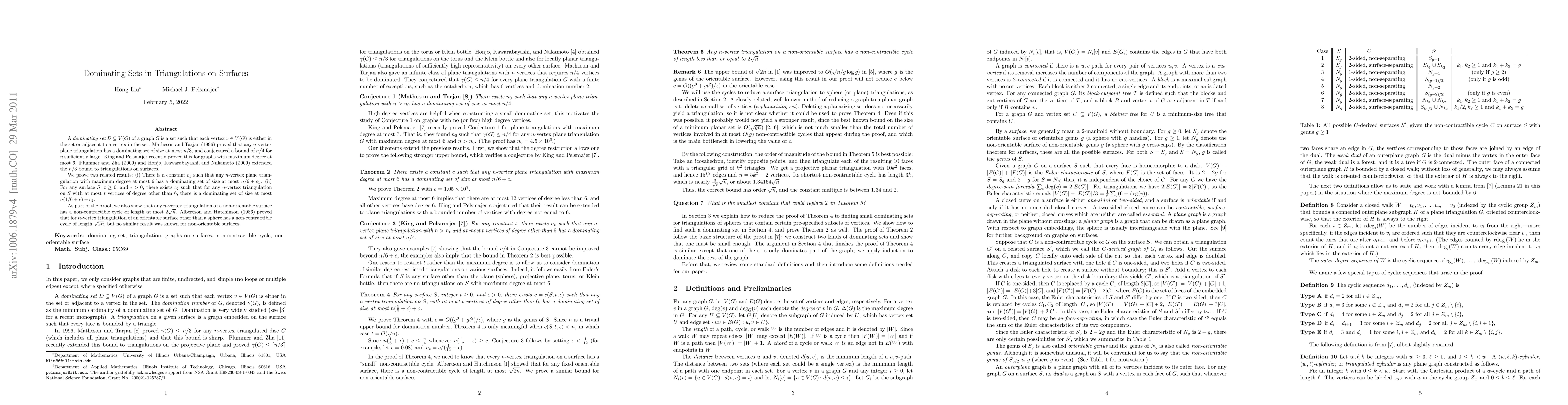 This paper proves two results on dominating sets in triangulations on surfaces: (i) Any n-vertex plane triangulation with maximum degree at most 6 has a dominating set of size at most n/6 + a constant c. (ii) For any surface S, any n-vertex triangulation with at most t vertices of degree other than 6 has a dominating set of size at most n(1/6 + ε) + C, with ε > 0. Additionally, the paper establishes that any n-vertex triangulation of a non-orientable surface has a non-contractible cycle of length at most 2√n.