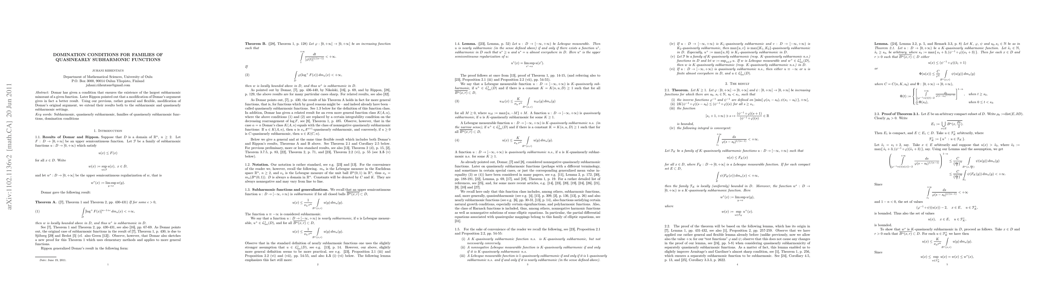 This paper extends Domar's and Rippon's conditions for the existence of the largest subharmonic minorant to quasinearly subharmonic functions, utilizing a flexible modification of Domar's original argument. The results provide a broader framework for analyzing these function types.