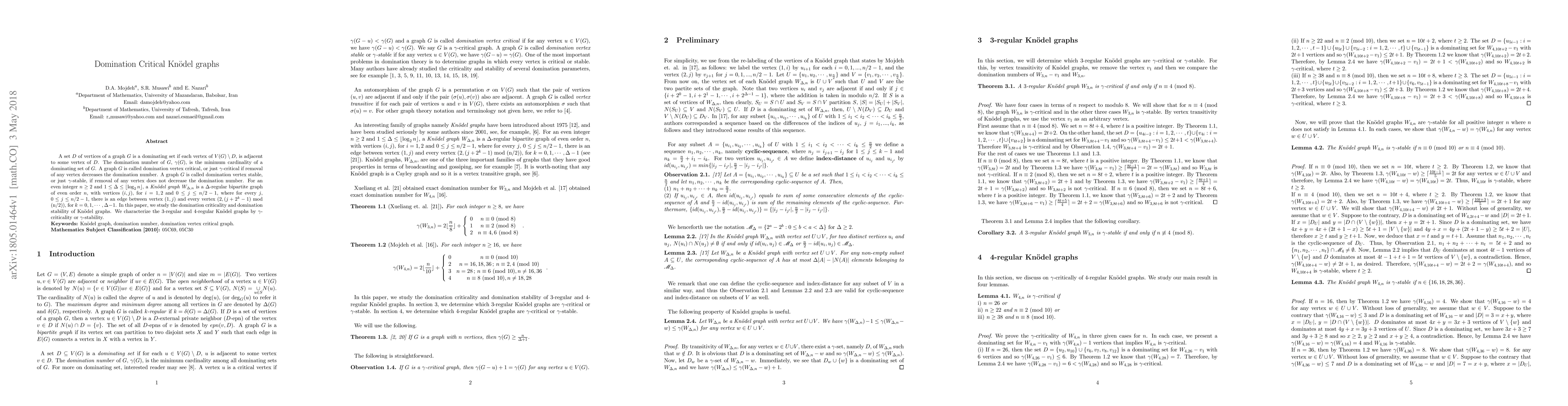 This paper studies the domination criticality and stability of Knodel graphs, characterizing 3-regular and 4-regular graphs as either $ u$-critical or $ u$-stable.