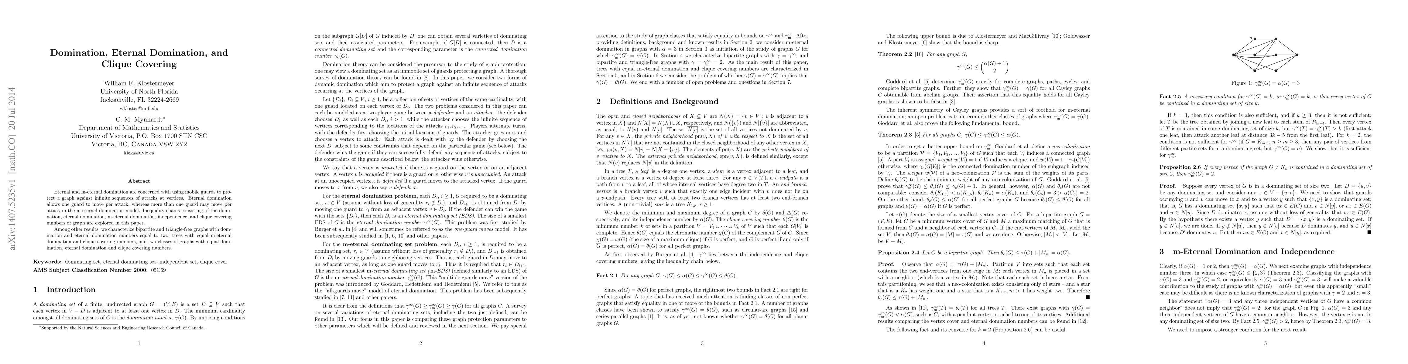 This paper explores various domination concepts, including eternal and m-eternal domination, and investigates inequality chains among these and related graph parameters. It characterizes specific classes of graphs with equal domination, eternal domination, and clique covering numbers, including bipartite and triangle-free graphs.