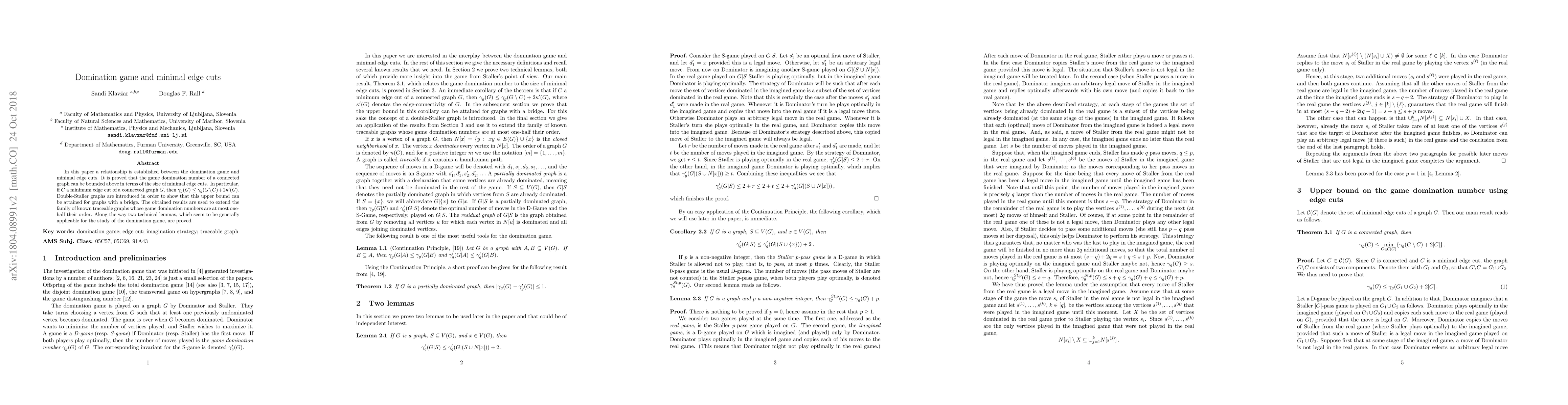 In this paper a relationship is established between the domination game and minimal edge cuts. It is proved that the game domination number of a connected graph can be bounded above in terms of the size of minimal edge cuts. In particular, if $C$ a minimum edge cut of a connected graph $G$, then $\gamma_g(G) \le \gamma_g(G\setminus C) + 2\kappa'(G)$. Double-Staller graphs are introduced in order to show that this upper bound can be attained for graphs with a bridge. The obtained results are used to extend the family of known traceable graphs whose game domination numbers are at most one-half their order. Along the way two technical lemmas, which seem to be generally applicable for the study of the domination game, are proved.