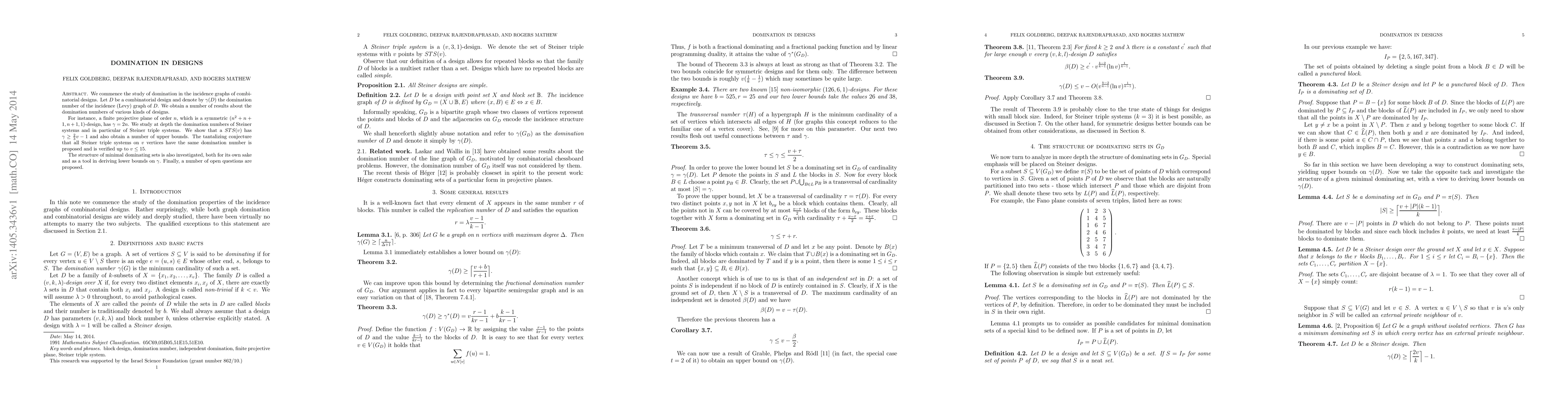 We commence the study of domination in the incidence graphs of combinatorial designs. Let $D$ be a combinatorial design and denote by $\gamma(D)$ the domination number of the incidence (Levy) graph of $D$. We obtain a number of results about the domination numbers of various kinds of designs. For instance, a finite projective plane of order $n$, which is a symmetric $(n^{2}+n+1,n+1,1)$-design, has $\gamma=2n$. %We also show that for any symmetric $(v,k,\lambda)$-design it holds that $\gamma \leq 2k$. We study at depth the domination numbers of Steiner systems and in particular of Steiner triple systems. We show that a $STS(v)$ has $\gamma \geq \frac{2}{3}v-1$ and also obtain a number of upper bounds. The tantalizing conjecture that all Steiner triple systems on $v$ vertices have the same domination number is proposed and is verified up to $v \leq 15$. The structure of minimal dominating sets is also investigated, both for its own sake and as a tool in deriving lower bounds on $\gamma$. Finally, a number of open questions are proposed.