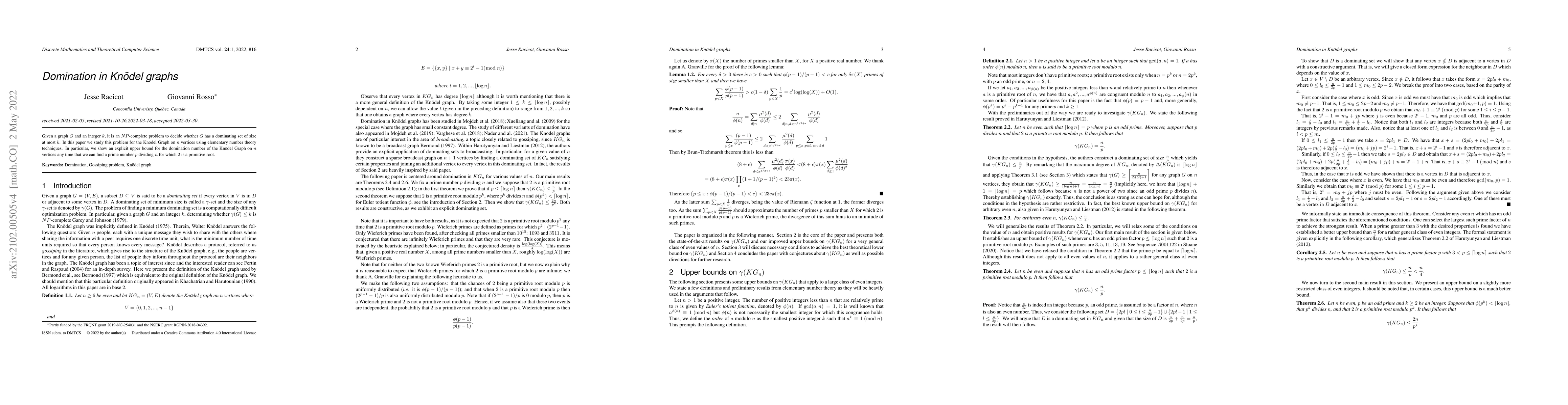 This paper investigates the NP-complete problem of finding a dominating set of size at most $k$ in Kn\"odel Graphs, employing elementary number theory to derive an explicit upper bound for the domination number when a prime $p$ dividing $n$ has $2$ as a primitive root.