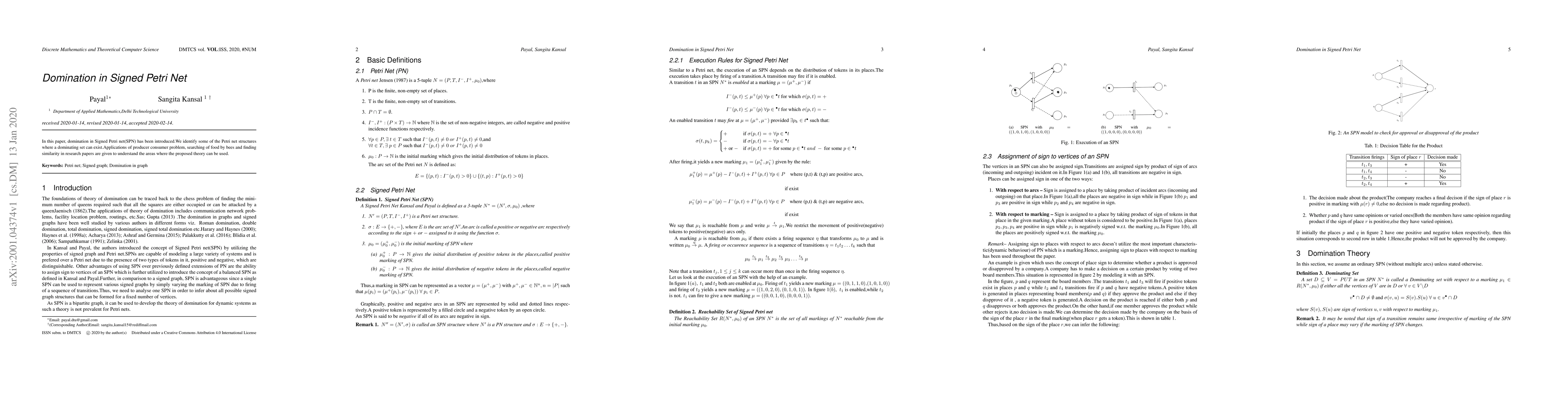 This paper introduces the concept of domination in Signed Petri Nets (SPN) and identifies specific Petri net structures that can accommodate a dominating set. It demonstrates applications in producer-consumer problems, bee foraging behavior, and research paper similarity analysis to illustrate potential uses of the proposed theory.