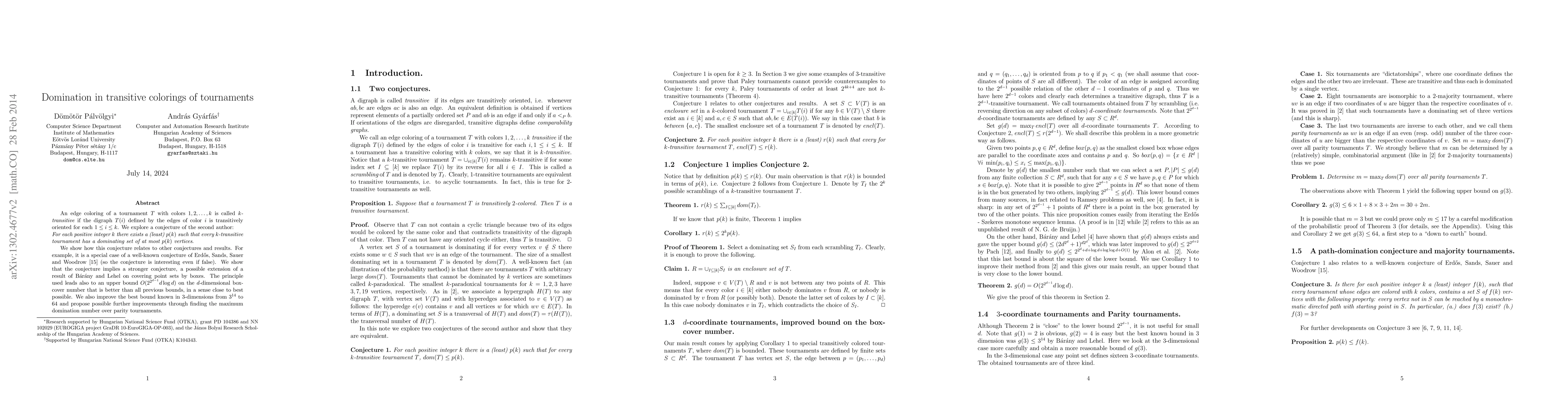 An edge coloring of a tournament $T$ with colors $1,2,\dots,k$ is called \it $k$-transitive \rm if the digraph $T(i)$ defined by the edges of color $i$ is transitively oriented for each $1\le i \le k$. We explore a conjecture of the second author: For each positive integer $k$ there exists a (least) $p(k)$ such that every $k$-transitive tournament has a dominating set of at most $p(k)$ vertices. We show how this conjecture relates to other conjectures and results. For example, it is a special case of a well-known conjecture of Erd\H os, Sands, Sauer and Woodrow (so the conjecture is interesting even if false). We show that the conjecture implies a stronger conjecture, a possible extension of a result of B\'ar\'any and Lehel on covering point sets by boxes. The principle used leads also to an upper bound $O(2^{2^{d-1}}d\log d)$ on the $d$-dimensional box-cover number that is better than all previous bounds, in a sense close to best possible. We also improve the best bound known in 3-dimensions from $3^{14}$ to 64 and propose possible further improvements through finding the maximum domination number over parity tournaments.