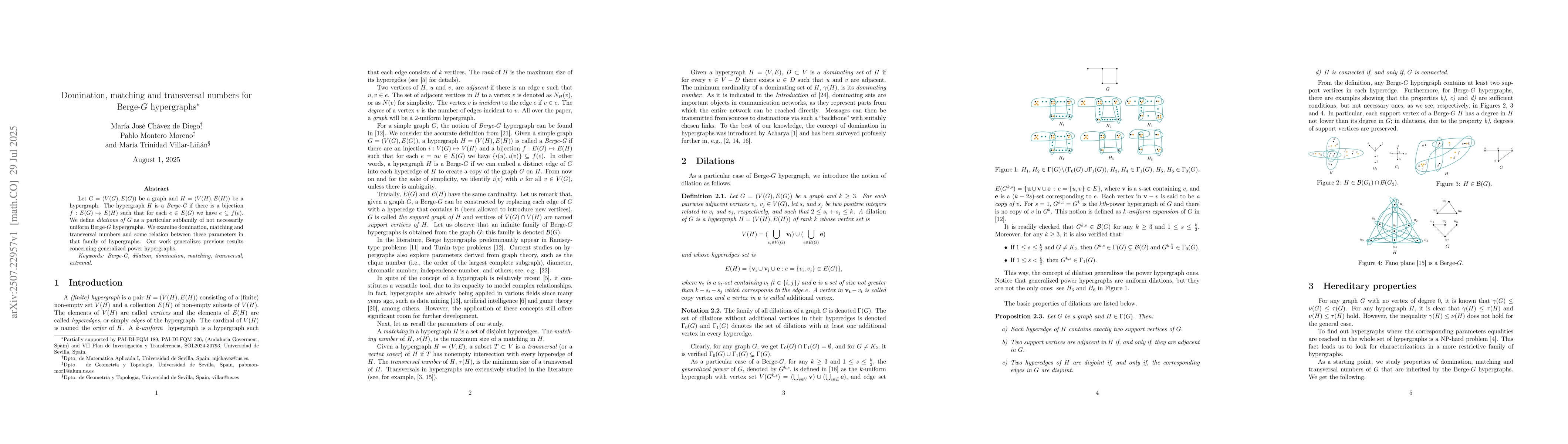 Let $G=(V(G),E(G))$ be a graph and $H=(V(H),E(H))$ be a hypergraph. The hypergraph $H$ is a {\it Berge-G} if there is a bijection $f : E(G) \mapsto E(H)$ such that for each $e \in E(G)$ we have $e \subseteq f(e)$. We define {\it dilations of $G$} as a particular subfamily of not necessarily uniform Berge-$G$ hypergraphs. We examine domination, matching and transversal numbers and some relation between these parameters in that family of hypergraphs. Our work generalizes previous results concerning generalized power hypergraphs.