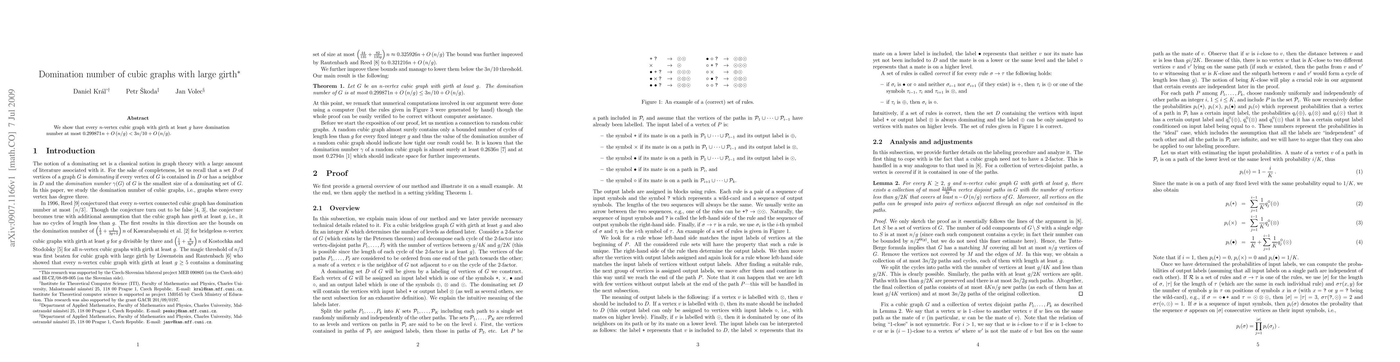We show that every n-vertex cubic graph with girth at least g have domination number at most 0.299871n+O(n/g)<3n/10+O(n/g).