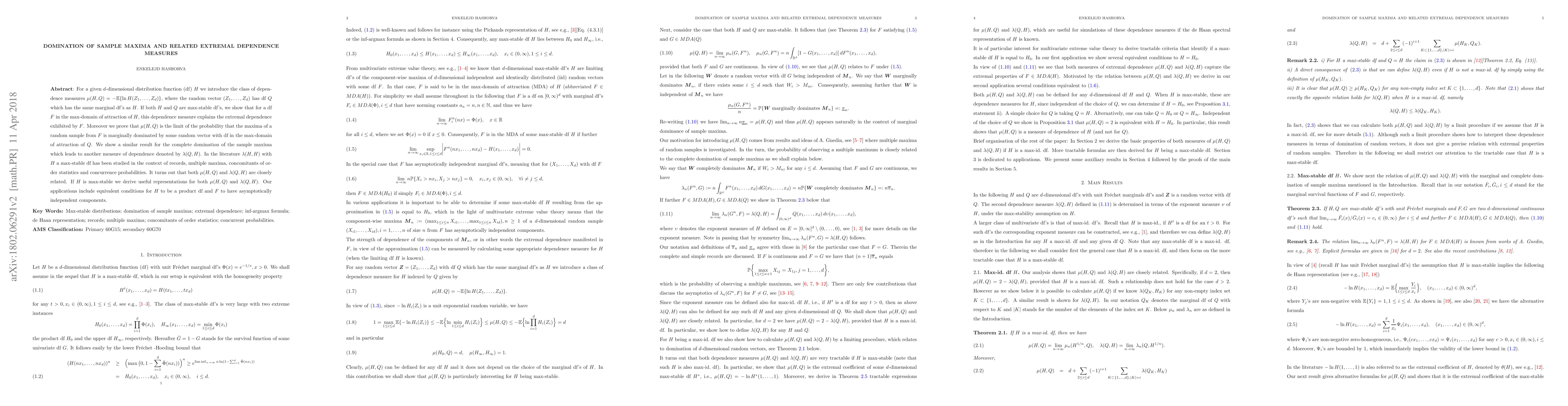 This paper introduces new dependence measures $\mu(H,Q)$ and $\lambda(Q,H)$ for $d$-dimensional distributions, showing that $\mu(H,Q)$ explains extremal dependence in distributions within the max-domain of attraction of $H$. It also proves that $\mu(H,Q)$ is the limit of the probability that sample maxima are dominated by vectors from the max-domain of attraction of $Q$, and provides useful representations for these measures when $H$ is max-stable.