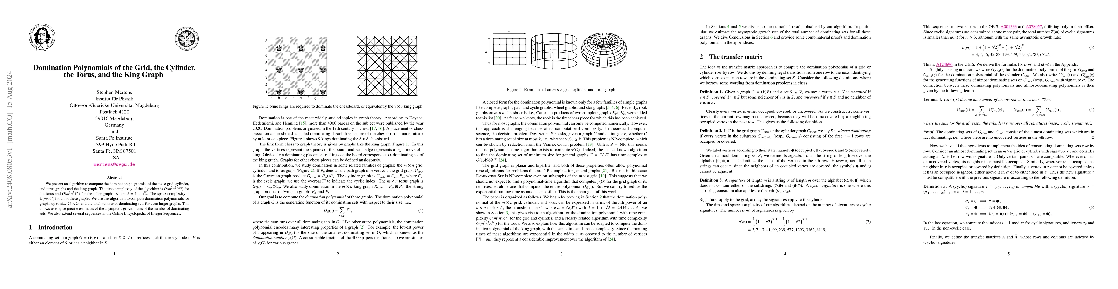 This paper introduces an efficient algorithm to compute the domination polynomial for grid, cylinder, torus, and king graphs with polynomial time complexity. The study computes these polynomials for graphs up to size 24×24 and estimates the asymptotic growth rates of dominating sets.