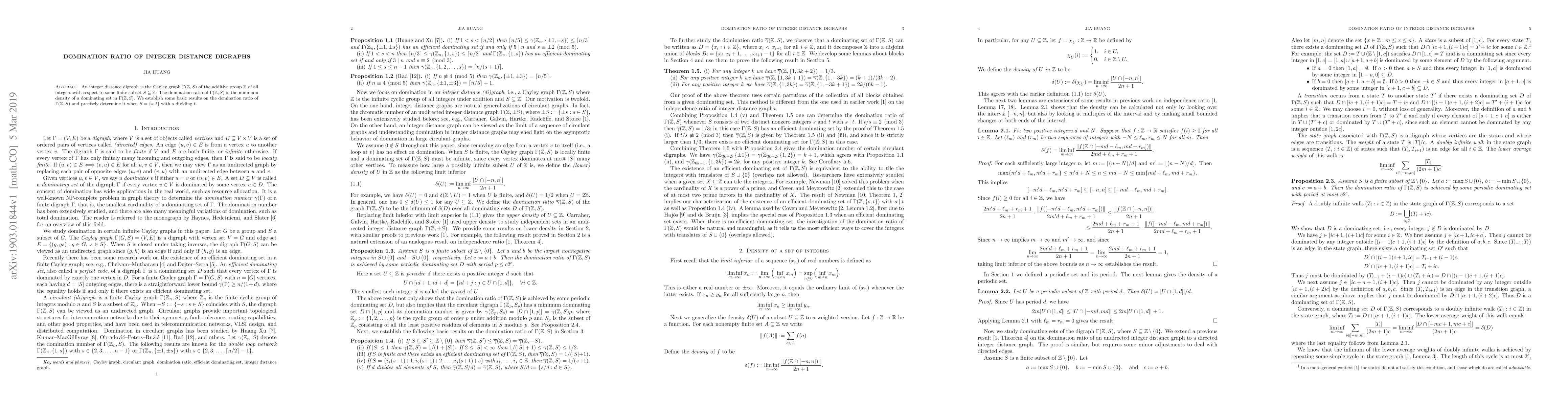 This paper investigates the domination ratio of integer distance digraphs, specifically Cayley graphs of the additive group of integers with respect to a finite subset S. It establishes some basic results and precisely determines the domination ratio when S contains two elements s and t where s divides t.