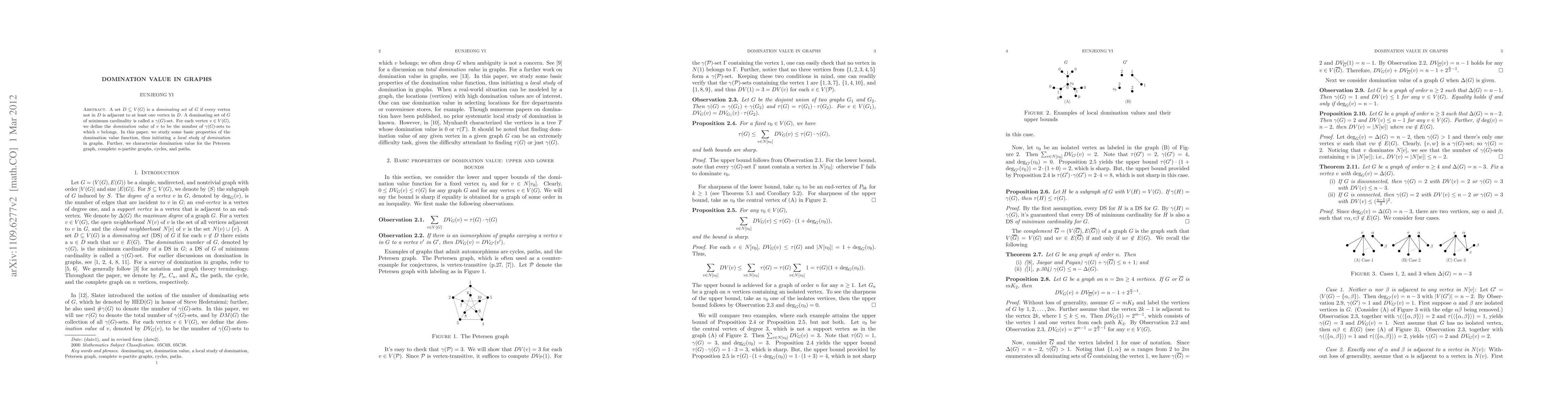 This paper investigates the concept of domination value in graphs, defined as the number of minimum dominating sets a vertex belongs to. It explores basic properties of this function and characterizes it for specific graph types, including the Petersen graph, complete $n$-partite graphs, cycles, and paths.