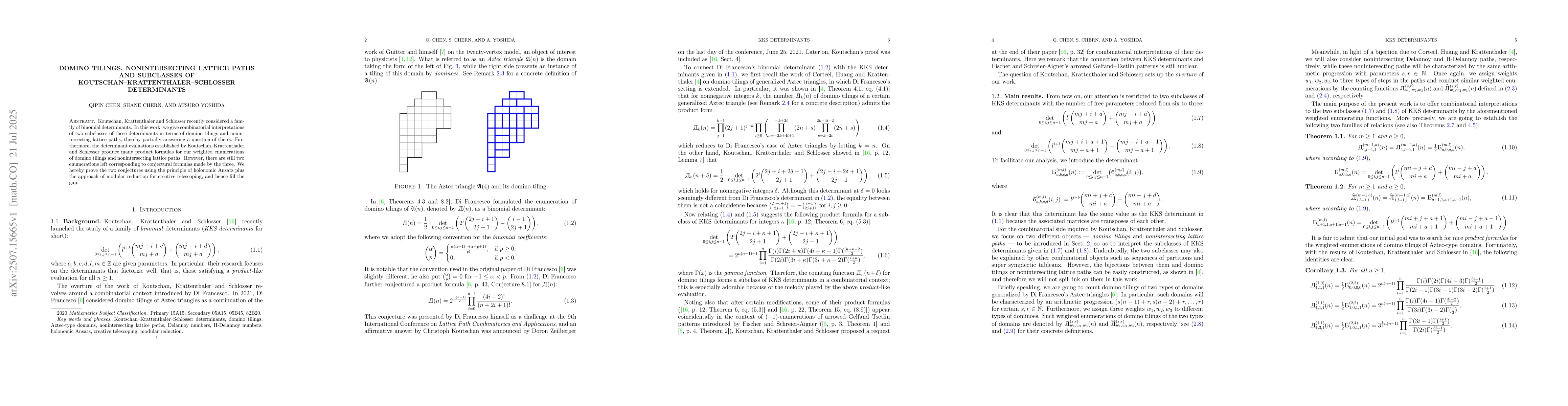 Koutschan, Krattenthaler and Schlosser recently considered a family of binomial determinants. In this work, we give combinatorial interpretations of two subclasses of these determinants in terms of domino tilings and nonintersecting lattice paths, thereby partially answering a question of theirs. Furthermore, the determinant evaluations established by Koutschan, Krattenthaler and Schlosser produce many product formulas for our weighted enumerations of domino tilings and nonintersecting lattice paths. However, there are still two enumerations left corresponding to conjectural formulas made by the three. We hereby prove the two conjectures using the principle of holonomic Ansatz plus the approach of modular reduction for creative telescoping, and hence fill the gap.