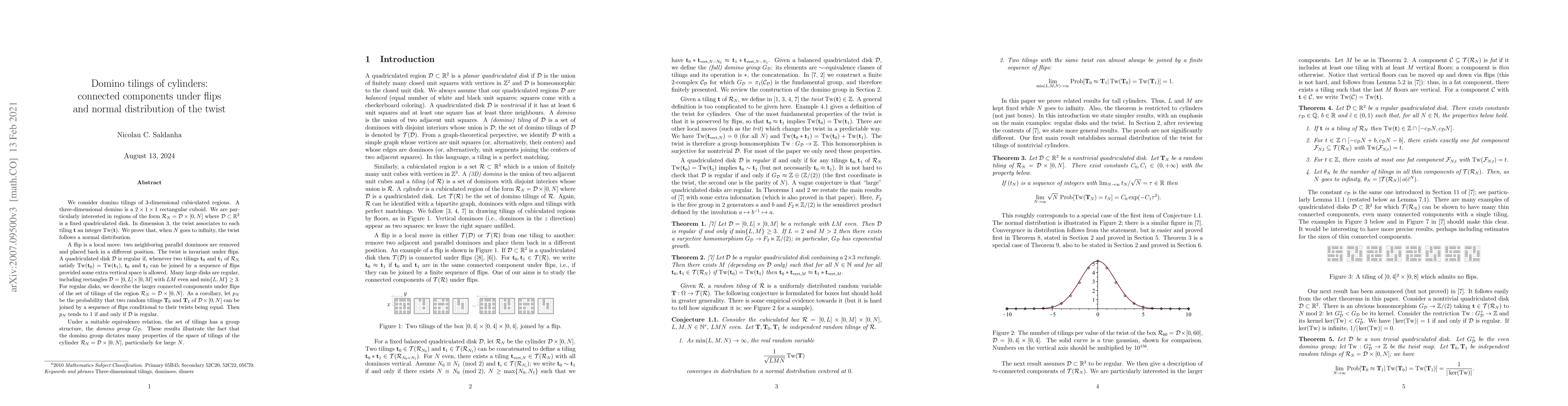 We consider domino tilings of $3$-dimensional cubiculated regions. A three-dimensional domino is a 2x2x1 rectangular cuboid. We are particularly interested in regions of the form $R_N = D \times [0,N]$ where $D$ is a fixed quadriculated disk. In dimension 3, the twist associates to each tiling $t$ an integer $Tw(t)$. We prove that, when $N$ goes to infinity, the twist follows a normal distribution. A flip is a local move: two neighboring parallel dominoes are removed and placed back in a different position. The twist is invariant under flips. A quadriculated disk $D$ is regular if, whenever two tilings $t_0$ and $t_1$ of $R_N$ satisfy $Tw(t_0) = Tw(t_1)$, $t_0$ and $t_1$ can be joined by a sequence of flips provided some extra vertical space is allowed. Many large disks are regular, including rectangles $D = [0,L] \times [0,M]$ with $LM$ even and $L,M \ge 3$. For regular disks, we describe the larger connected components under flips of the set of tilings of the region $R_N = D \times [0,N]$. As a corollary, let $p_N$ be the probability that two random tilings $T_0$ and $T_1$ of $D \times [0,N]$ can be joined by a sequence of flips conditional to their twists being equal. Then $p_N$ tends to 1 if and only if $D$ is regular. Under a suitable equivalence relation, the set of tilings has a group structure, the domino group. These results illustrate the fact that the domino group dictates many properties of the space of tilings of the cylinder $R_N = D \times [0,N]$, particularly for large $N$.