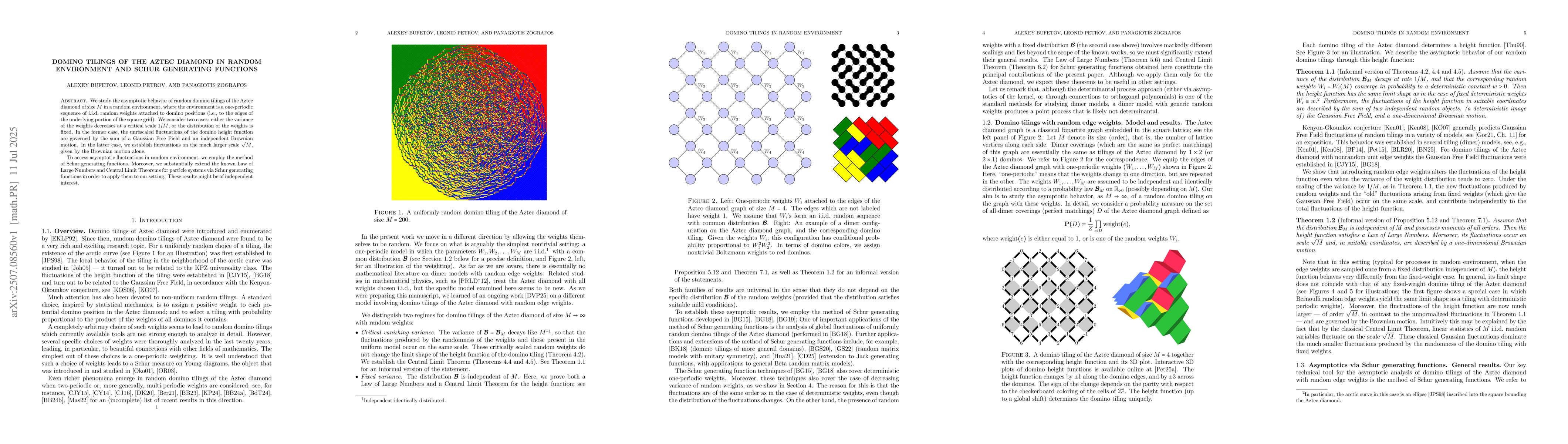 We study the asymptotic behavior of random domino tilings of the Aztec diamond of size $M$ in a random environment, where the environment is a one-periodic sequence of i.i.d. random weights attached to domino positions (i.e., to the edges of the underlying portion of the square grid). We consider two cases: either the variance of the weights decreases at a critical scale $1/M$, or the distribution of the weights is fixed. In the former case, the unrescaled fluctuations of the domino height function are governed by the sum of a Gaussian Free Field and an independent Brownian motion. In the latter case, we establish fluctuations on the much larger scale $\sqrt M$, given by the Brownian motion alone. To access asymptotic fluctuations in random environment, we employ the method of Schur generating functions. Moreover, we substantially extend the known Law of Large Numbers and Central Limit Theorems for particle systems via Schur generating functions in order to apply them to our setting. These results might be of independent interest.