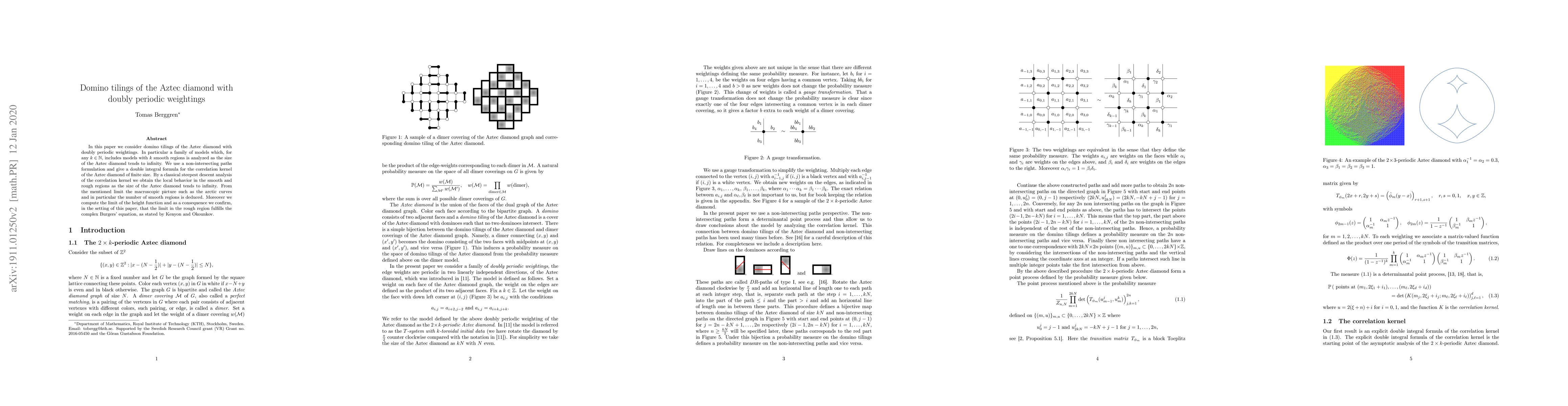 In this paper we consider domino tilings of the Aztec diamond with doubly periodic weightings. In particular a family of models which, for any $ k \in \mathbb{N} $, includes models with $ k $ smooth regions is analyzed as the size of the Aztec diamond tends to infinity. We use a non-intersecting paths formulation and give a double integral formula for the correlation kernel of the Aztec diamond of finite size. By a classical steepest descent analysis of the correlation kernel we obtain the local behavior in the smooth and rough regions as the size of the Aztec diamond tends to infinity. From the mentioned limit the macroscopic picture such as the arctic curves and in particular the number of smooth regions is deduced. Moreover we compute the limit of the height function and as a consequence we confirm, in the setting of this paper, that the limit in the rough region fulfills the complex Burgers' equation, as stated by Kenyon and Okounkov.
