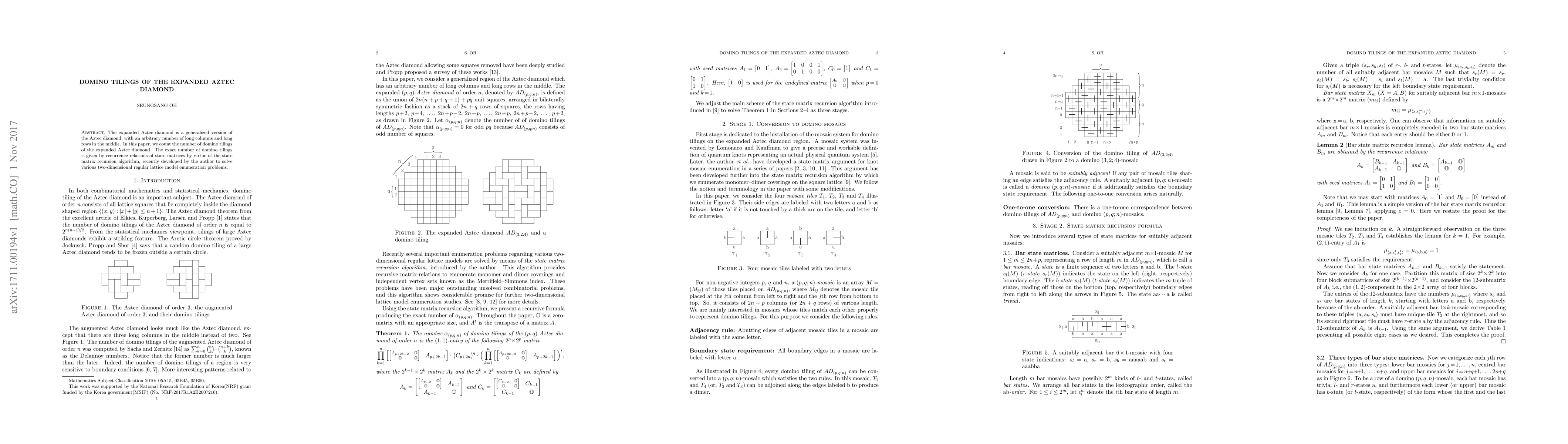 This paper counts the number of domino tilings for the expanded Aztec diamond using recurrence relations derived from state matrix recursion algorithms, providing a new tool for solving enumeration problems in two-dimensional regular lattice models.