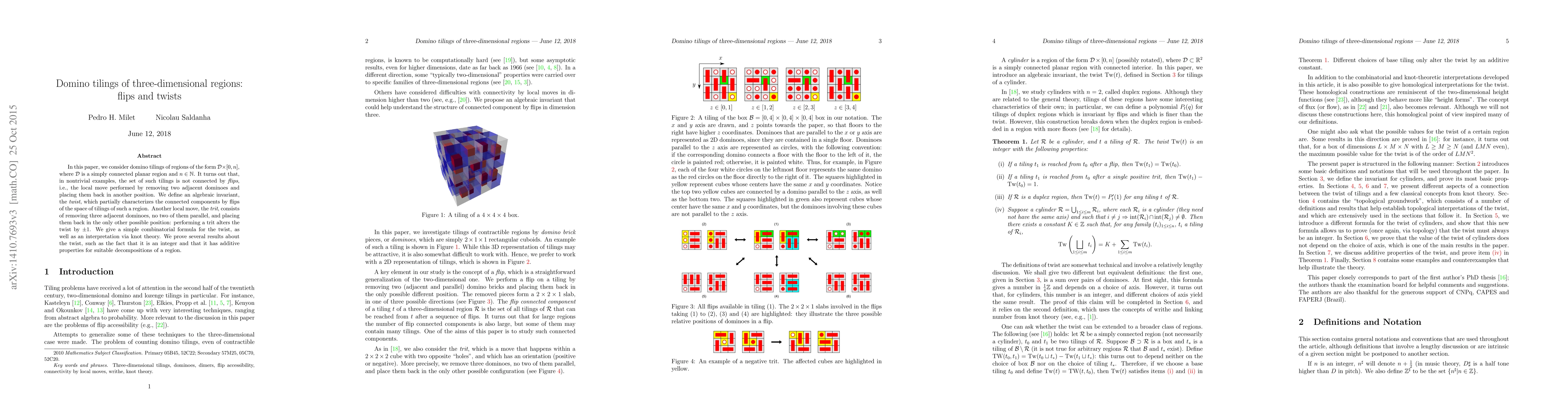 This paper explores domino tilings of three-dimensional regions formed by a planar base and a vertical extension, introducing the twist invariant to characterize connected components by flips. It also defines the trit move, which alters the twist by ±1, and provides combinatorial and knot-theoretic interpretations of the twist.