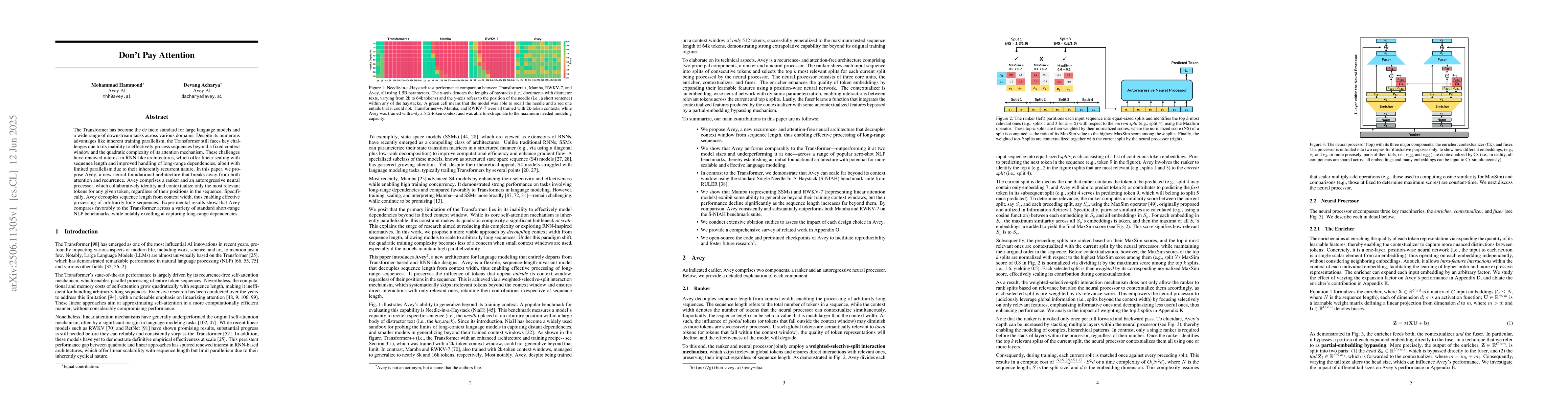 The Transformer has become the de facto standard for large language models and a wide range of downstream tasks across various domains. Despite its numerous advantages like inherent training parallelism, the Transformer still faces key challenges due to its inability to effectively process sequences beyond a fixed context window and the quadratic complexity of its attention mechanism. These challenges have renewed interest in RNN-like architectures, which offer linear scaling with sequence length and improved handling of long-range dependencies, albeit with limited parallelism due to their inherently recurrent nature. In this paper, we propose Avey, a new neural foundational architecture that breaks away from both attention and recurrence. Avey comprises a ranker and an autoregressive neural processor, which collaboratively identify and contextualize only the most relevant tokens for any given token, regardless of their positions in the sequence. Specifically, Avey decouples sequence length from context width, thus enabling effective processing of arbitrarily long sequences. Experimental results show that Avey compares favorably to the Transformer across a variety of standard short-range NLP benchmarks, while notably excelling at capturing long-range dependencies.