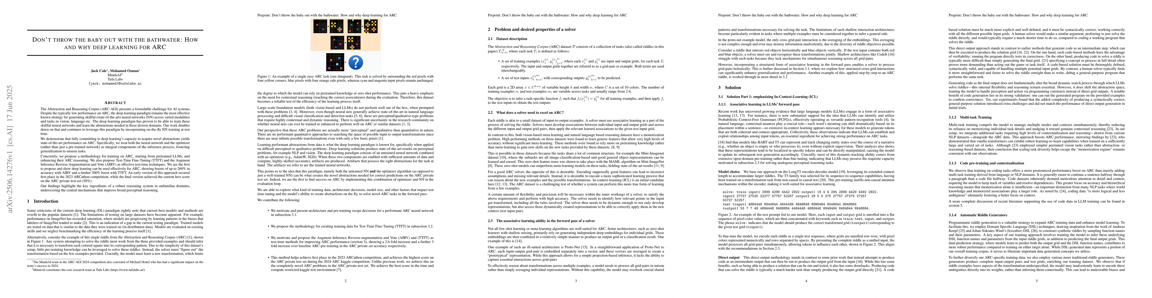 The research paper proposes enhancing deep learning's effectiveness on the challenging Abstraction and Reasoning Corpus (ARC) task. By integrating on-the-fly neural network training at test time, the authors introduce Test-Time Fine-Tuning (TTFT) and Augment Inference Reverse-Augmentation and Vote (AIRV) techniques. Their method, starting with pretrained language models, significantly boosts ARC accuracy by up to 300%, setting the new best score at 58% in the ARC private test-set, showcasing deep learning's potential for general reasoning across diverse domains.