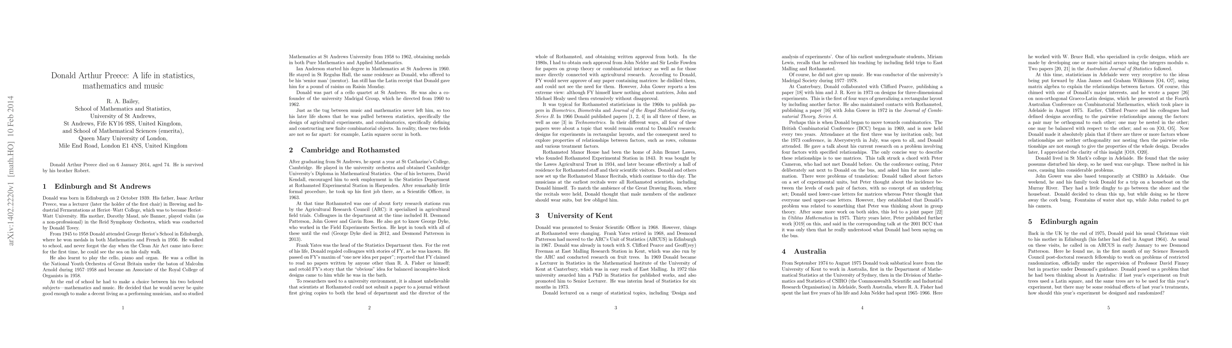 Biography and publications list for Donald Arthur Preece, who died on 6 January 2014, who made many contributions in statistics (experimental design) and in combinatorics.