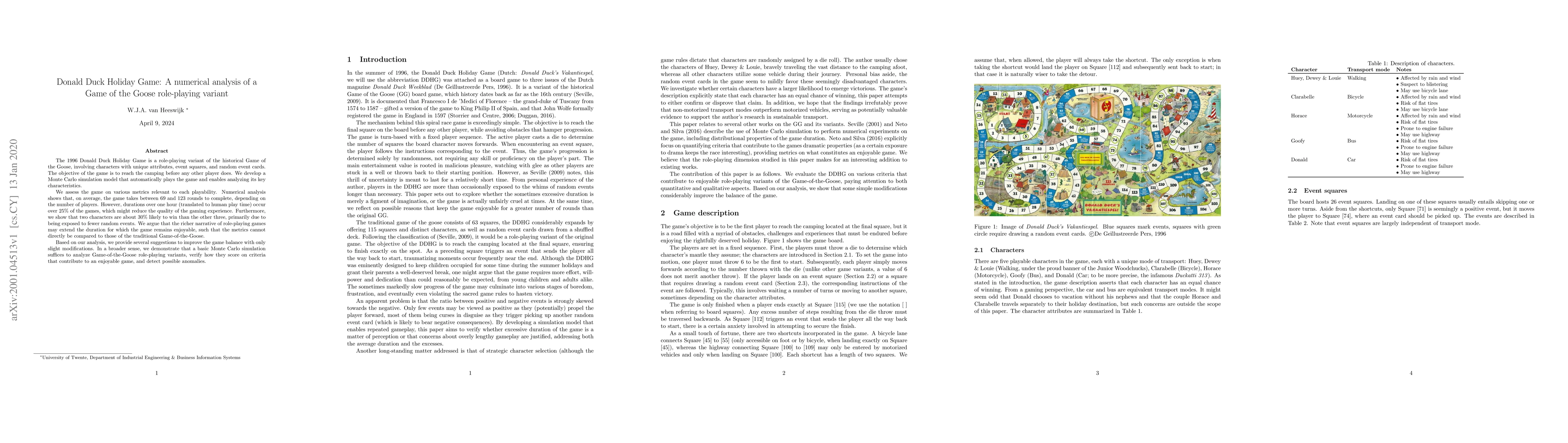 The 1996 Donald Duck Holiday Game is a role-playing variant of the historical Game of the Goose, involving characters with unique attributes, event squares, and random event cards. The objective of the game is to reach the camping before any other player does. We develop a Monte Carlo simulation model that automatically plays the game and enables analyzing its key characteristics. We assess the game on various metrics relevant to each playability. Numerical analysis shows that, on average, the game takes between 69 and 123 rounds to complete, depending on the number of players. However, durations over one hour (translated to human play time) occur over 25% of the games, which might reduce the quality of the gaming experience. Furthermore, we show that two characters are about 30% likely to win than the other three, primarily due to being exposed to fewer random events. We argue that the richer narrative of role-playing games may extend the duration for which the game remains enjoyable, such that the metrics cannot directly be compared to those of the traditional Game-of-the-Goose. Based on our analysis, we provide several suggestions to improve the game balance with only slight modifications. In a broader sense, we demonstrate that a basic Monte Carlo simulation suffices to analyze Game-of-the-Goose role-playing variants, verify how they score on criteria that contribute to an enjoyable game, and detect possible anomalies.