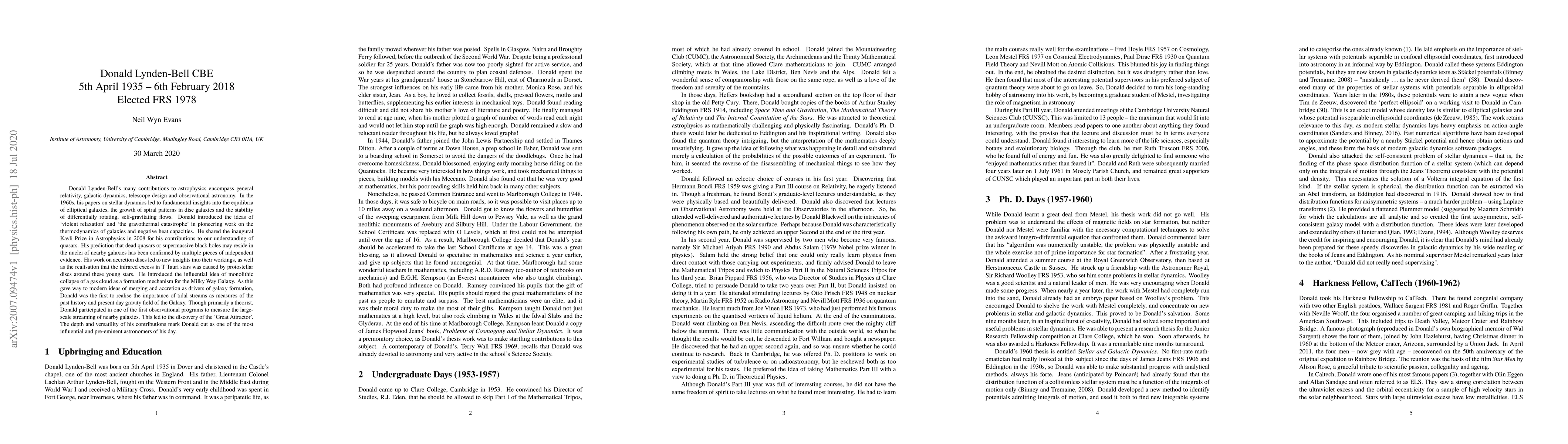Donald Lynden-Bell's many contributions to astrophysics encompass general relativity, galactic dynamics, telescope design and observational astronomy. In the 1960s, his papers on stellar dynamics led to fundamental insights into the equilibria of elliptical galaxies, the growth of spiral patterns in disc galaxies and the stability of differentially rotating, self-gravitating flows. Donald introduced the ideas of `violent relaxation' and `the gravothermal catastrophe' in pioneering work on the thermodynamics of galaxies and negative heat capacities. He shared the inaugural Kavli Prize in Astrophysics in 2008 for his contributions to our understanding of quasars. His prediction that dead quasars or supermassive black holes may reside in the nuclei of nearby galaxies has been confirmed by multiple pieces of independent evidence. His work on accretion discs led to new insights into their workings, as well as the realisation that the infrared excess in T Tauri stars was caused by protostellar discs around these young stars. He introduced the influential idea of monolithic collapse of a gas cloud as a formation mechanism for the Milky Way Galaxy. As this gave way to modern ideas of merging and accretion as drivers of galaxy formation, Donald was the first to realise the importance of tidal streams as measures of the past history and present day gravity field of the Galaxy. Though primarily a theorist, Donald participated in one of the first observational programs to measure the large-scale streaming of nearby galaxies. This led to the discovery of the `Great Attractor'. The depth and versatility of his contributions mark Donald out as one of the most influential and pre-eminent astronomers of his day.