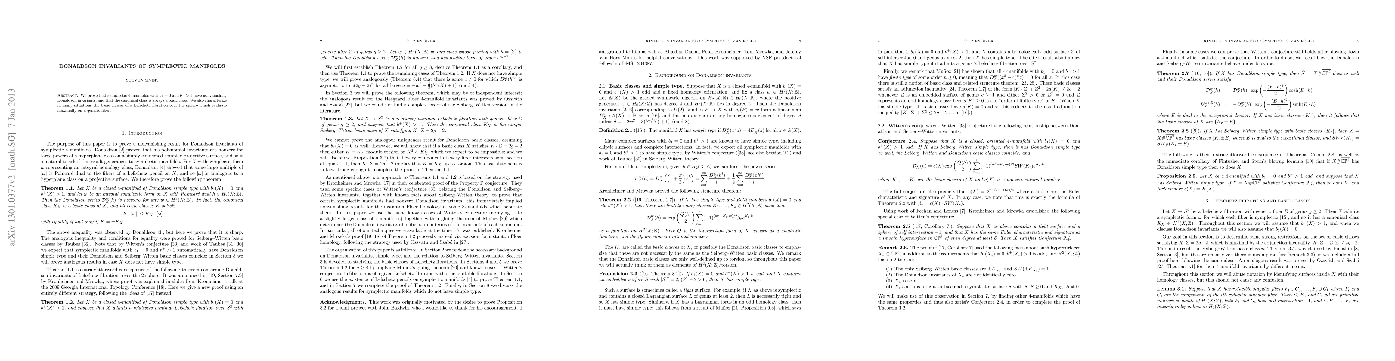 This paper proves that symplectic 4-manifolds with specific properties have non-zero Donaldson invariants and that their canonical class is always a basic class.