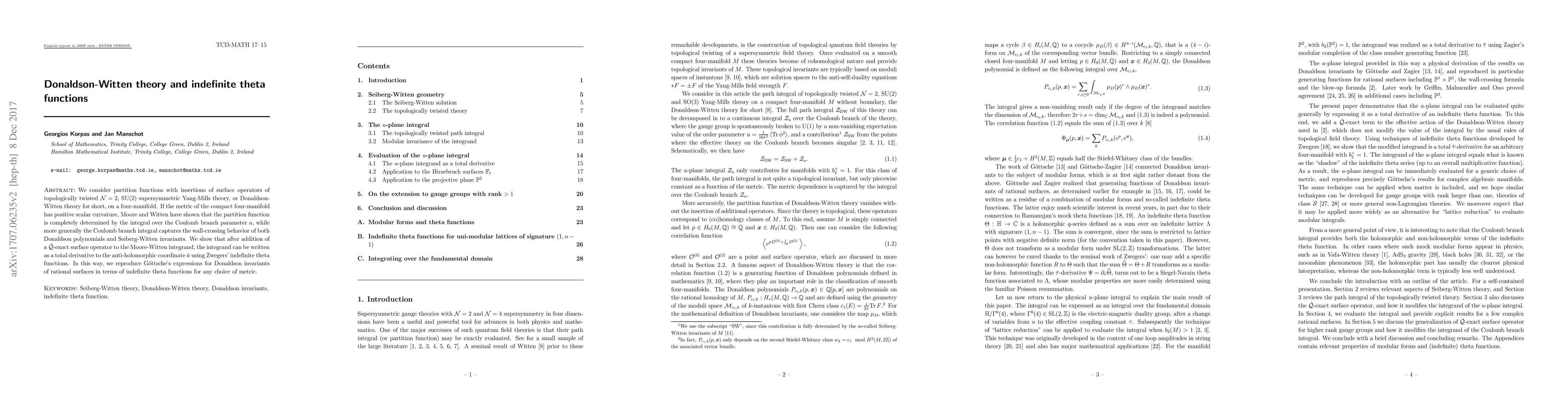 This paper explores partition functions in Donaldson-Witten theory with surface operator insertions on four-manifolds, demonstrating that the Coulomb branch integral can be expressed as a total derivative using Zwegers' indefinite theta functions. This approach reproduces Göttsche's expressions for Donaldson invariants in terms of indefinite theta functions, regardless of the metric.