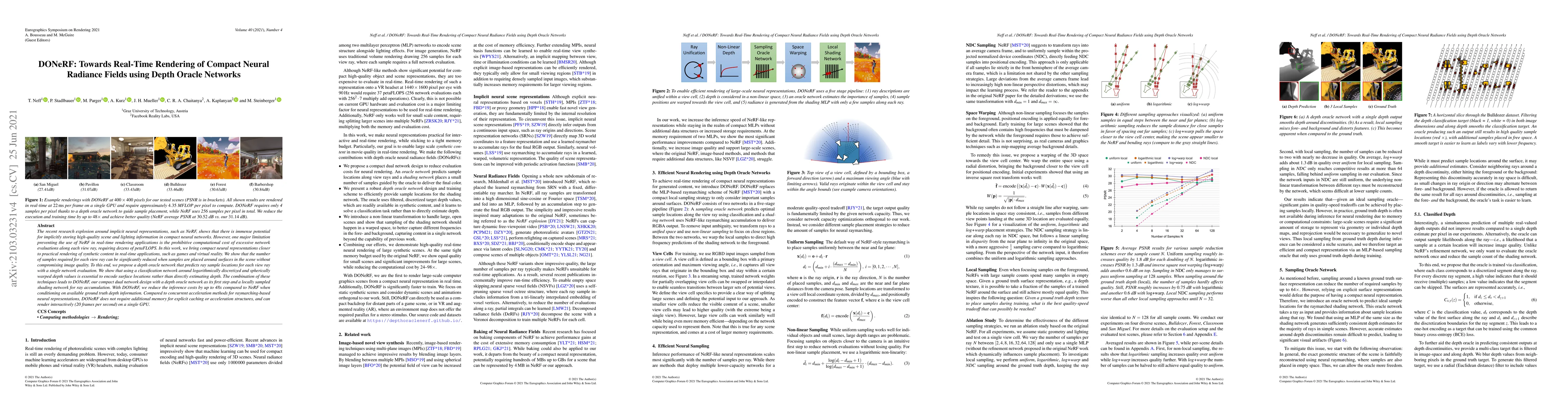 Researchers developed DONeRF, a compact neural rendering system that reduces computational cost by up to 48x compared to traditional NeRF methods, enabling real-time rendering of synthetic content.