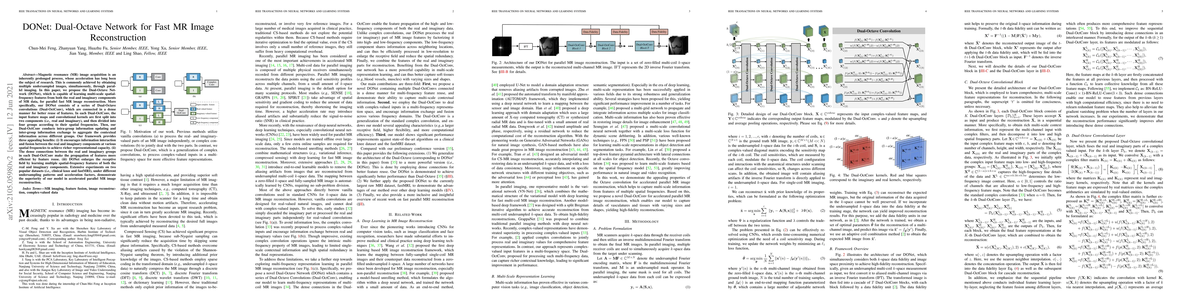 Magnetic resonance (MR) image acquisition is an inherently prolonged process, whose acceleration has long been the subject of research. This is commonly achieved by obtaining multiple undersampled images, simultaneously, through parallel imaging. In this paper, we propose the Dual-Octave Network (DONet), which is capable of learning multi-scale spatial-frequency features from both the real and imaginary components of MR data, for fast parallel MR image reconstruction. More specifically, our DONet consists of a series of Dual-Octave convolutions (Dual-OctConv), which are connected in a dense manner for better reuse of features. In each Dual-OctConv, the input feature maps and convolutional kernels are first split into two components (ie, real and imaginary), and then divided into four groups according to their spatial frequencies. Then, our Dual-OctConv conducts intra-group information updating and inter-group information exchange to aggregate the contextual information across different groups. Our framework provides three appealing benefits: (i) It encourages information interaction and fusion between the real and imaginary components at various spatial frequencies to achieve richer representational capacity. (ii) The dense connections between the real and imaginary groups in each Dual-OctConv make the propagation of features more efficient by feature reuse. (iii) DONet enlarges the receptive field by learning multiple spatial-frequency features of both the real and imaginary components. Extensive experiments on two popular datasets (ie, clinical knee and fastMRI), under different undersampling patterns and acceleration factors, demonstrate the superiority of our model in accelerated parallel MR image reconstruction.