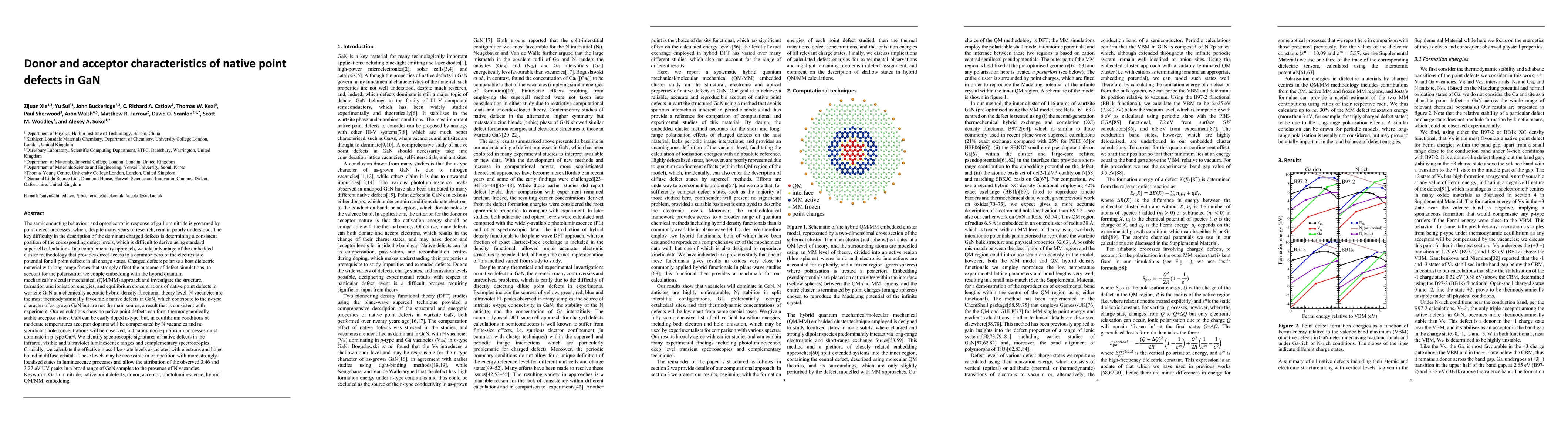 This paper investigates the characteristics of native point defects in GaN using hybrid quantum mechanical/molecular mechanical methods, revealing that N vacancies are the most thermodynamically favorable defects contributing to n-type doping. It concludes that no native point defects can form stable acceptor states, suggesting that p-type GaN is dominated by non-equilibrium processes.