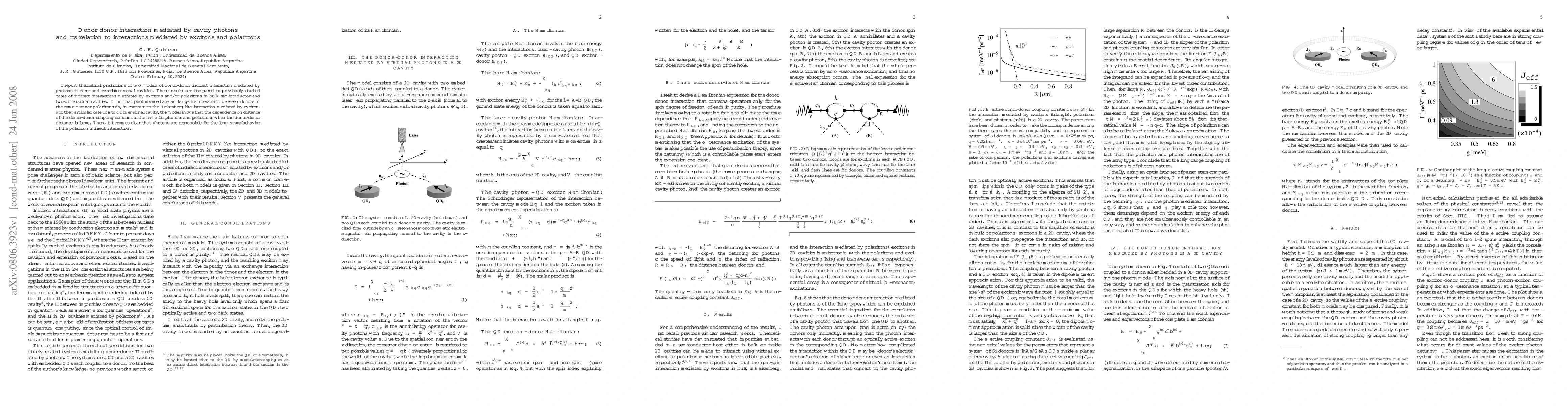 I report theoretical predictions of two models of donor-donor indirect interaction mediated by photons in zero- and two-dimensional cavities. These results are compared to previously studied cases of indirect interactions mediated by excitons and/or polaritons in bulk semiconductor and two-dimensional cavities. I find that photons mediate an Ising-like interaction between donors in the same manner polaritons do, in contrast to the Heisenberg-like interaction mediated by exciton. For the particular case of a two-dimensional cavity, the model shows that the dependence on distance of the donor-donor coupling constant is the same for photons and polaritons when the donor-donor distance is large. Then, it becomes clear that photons are responsible for the long range behavior of the polariton indirect interaction.