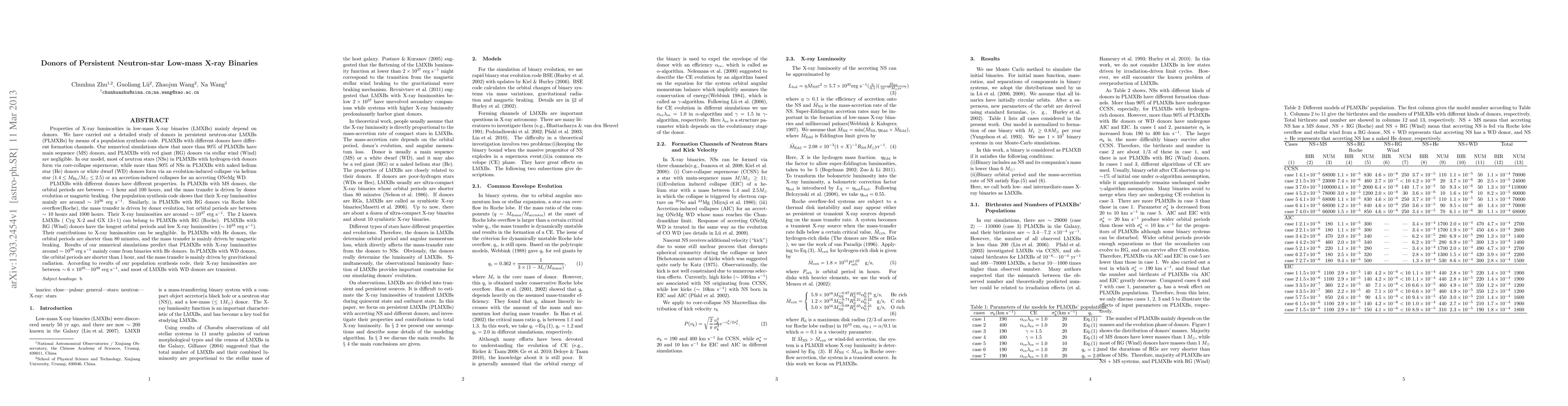 This paper investigates the properties of donors in persistent neutron-star low-mass X-ray binaries (PLMXBs) using a population synthesis code. The study finds that over 90% of PLMXBs have main sequence donors, while those with red giant donors via stellar wind are rare. Neutron stars in these systems predominantly form through different mechanisms depending on the donor type.