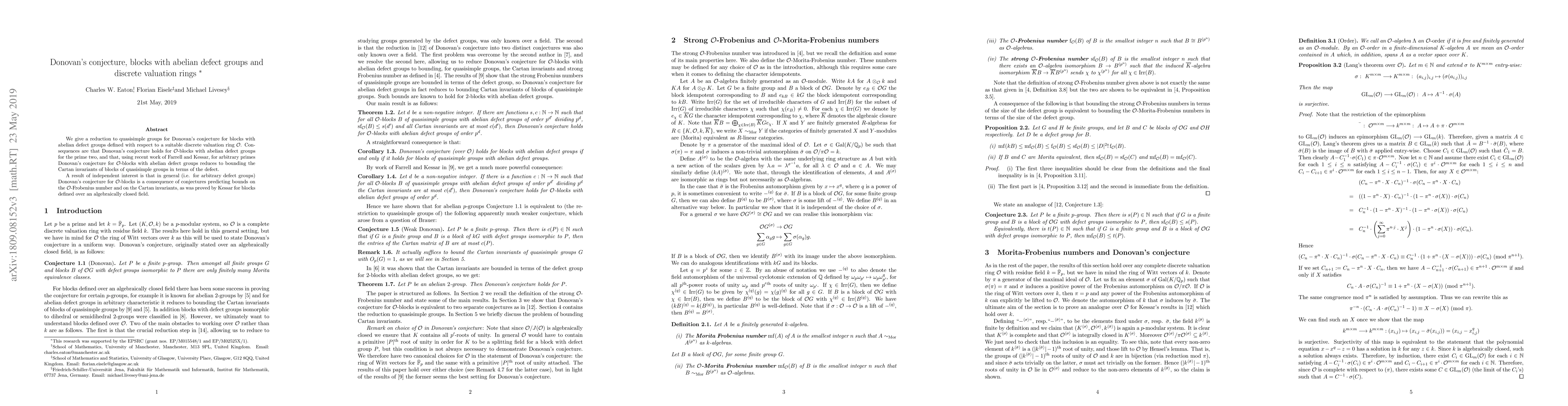 Donovan's conjecture for blocks with abelian defect groups over discrete valuation rings is reduced to quasisimple groups, proving it holds for the prime two. For arbitrary primes, the conjecture relies on bounding Cartan invariants of quasisimple groups.