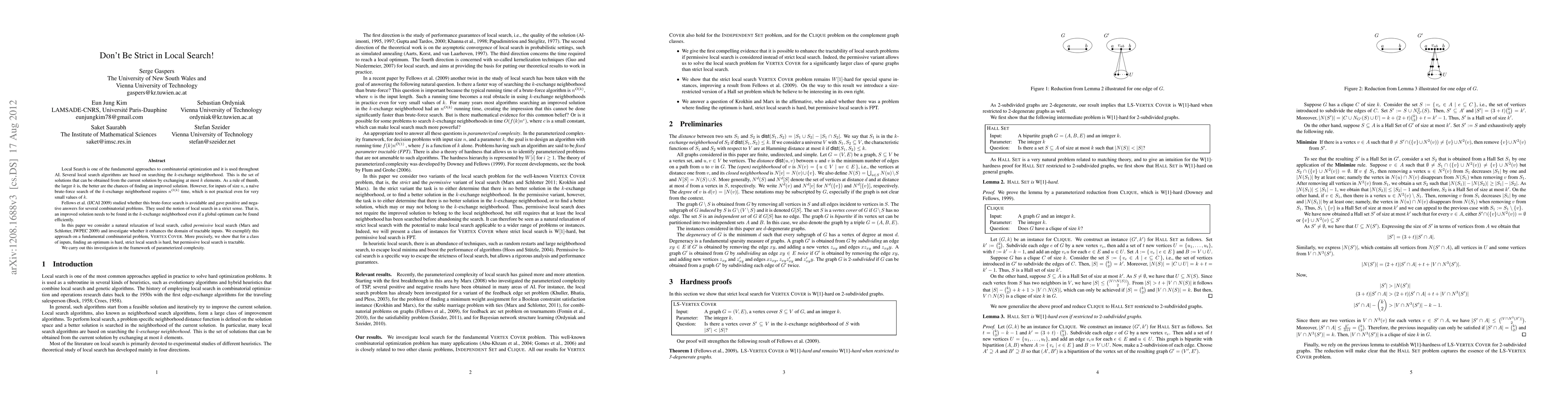 Local Search is one of the fundamental approaches to combinatorial optimization and it is used throughout AI. Several local search algorithms are based on searching the k-exchange neighborhood. This is the set of solutions that can be obtained from the current solution by exchanging at most k elements. As a rule of thumb, the larger k is, the better are the chances of finding an improved solution. However, for inputs of size n, a na\"ive brute-force search of the k-exchange neighborhood requires n to the power of O(k) time, which is not practical even for very small values of k. Fellows et al. (IJCAI 2009) studied whether this brute-force search is avoidable and gave positive and negative answers for several combinatorial problems. They used the notion of local search in a strict sense. That is, an improved solution needs to be found in the k-exchange neighborhood even if a global optimum can be found efficiently. In this paper we consider a natural relaxation of local search, called permissive local search (Marx and Schlotter, IWPEC 2009) and investigate whether it enhances the domain of tractable inputs. We exemplify this approach on a fundamental combinatorial problem, Vertex Cover. More precisely, we show that for a class of inputs, finding an optimum is hard, strict local search is hard, but permissive local search is tractable. We carry out this investigation in the framework of parameterized complexity.