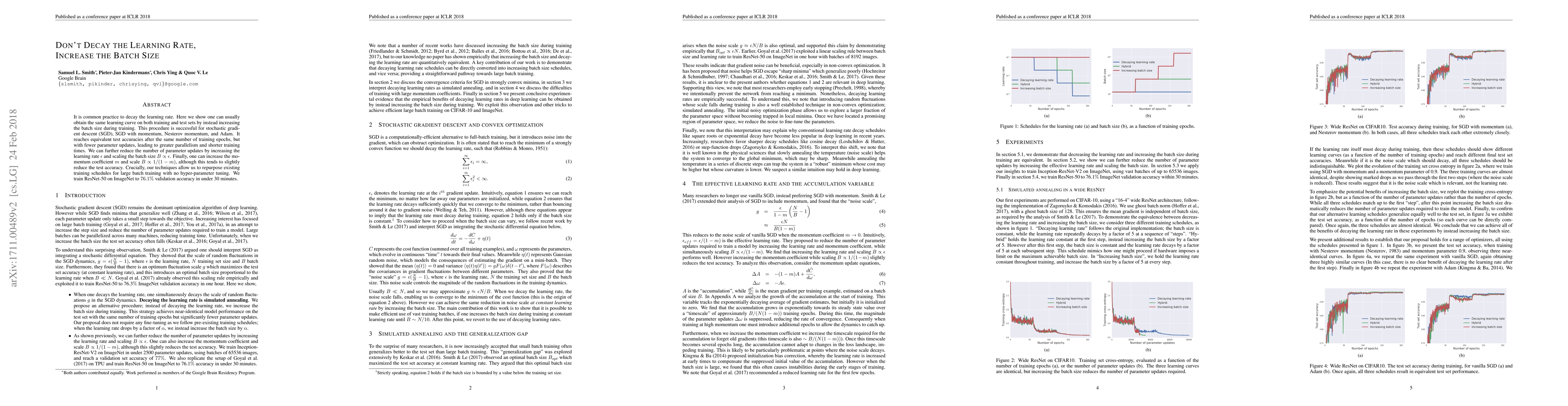 This paper demonstrates that increasing the batch size during training can achieve similar learning curves and test accuracies as traditional learning rate decay, for various optimization algorithms. This approach reduces training time and enhances parallelism without requiring hyperparameter tuning.