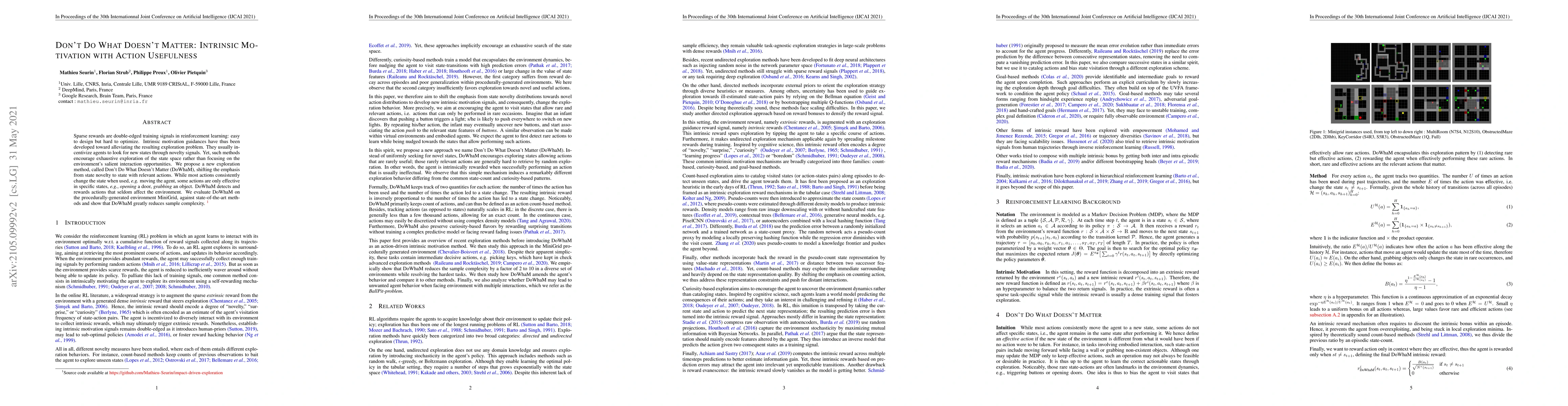 The paper proposes a novel intrinsic motivation method called Don't Do What Doesn't Matter (DoWhaM) to guide reinforcement learning agents to focus on actions that are relevant to the environment, rather than exploring all state novelty. DoWhaM reduces sample complexity by rewarding actions that have minimal effect on the environment, demonstrating improved efficiency in a procedurally-generated environment.