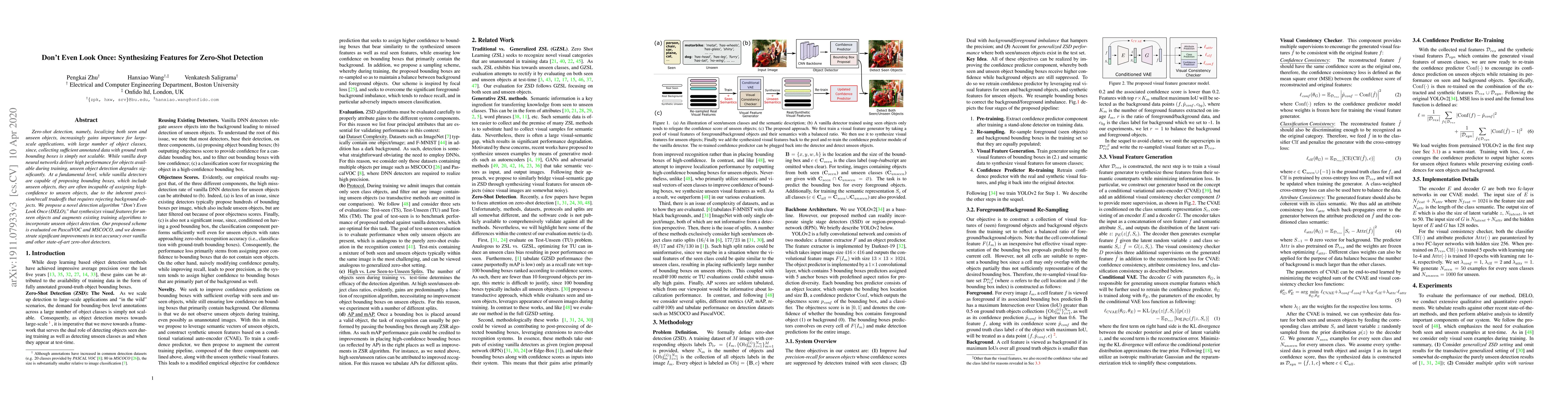 Zero-shot detection, namely, localizing both seen and unseen objects, increasingly gains importance for large-scale applications, with large number of object classes, since, collecting sufficient annotated data with ground truth bounding boxes is simply not scalable. While vanilla deep neural networks deliver high performance for objects available during training, unseen object detection degrades significantly. At a fundamental level, while vanilla detectors are capable of proposing bounding boxes, which include unseen objects, they are often incapable of assigning high-confidence to unseen objects, due to the inherent precision/recall tradeoffs that requires rejecting background objects. We propose a novel detection algorithm Dont Even Look Once (DELO), that synthesizes visual features for unseen objects and augments existing training algorithms to incorporate unseen object detection. Our proposed scheme is evaluated on Pascal VOC and MSCOCO, and we demonstrate significant improvements in test accuracy over vanilla and other state-of-art zero-shot detectors