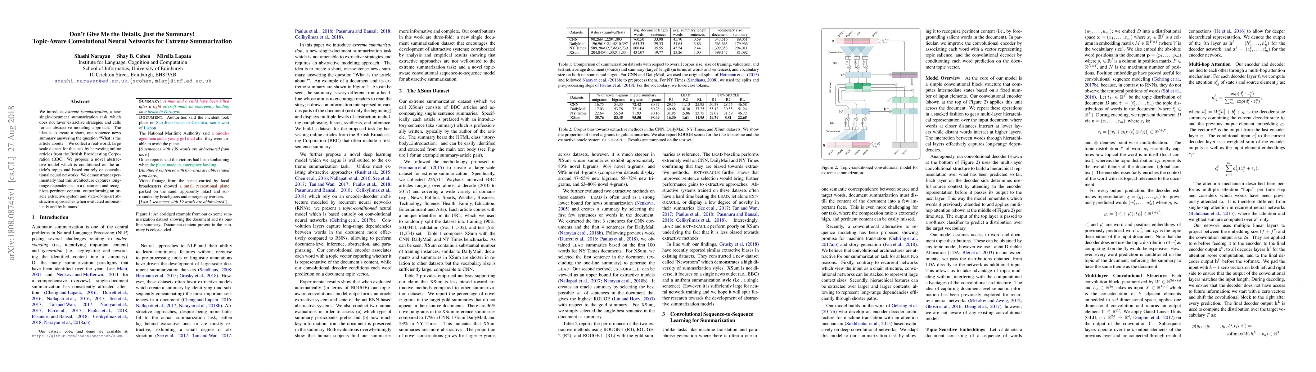 Researchers developed a new model to create short summaries of articles by recognizing topics and content using convolutional neural networks. Their approach outperformed existing models when evaluated automatically and by humans.