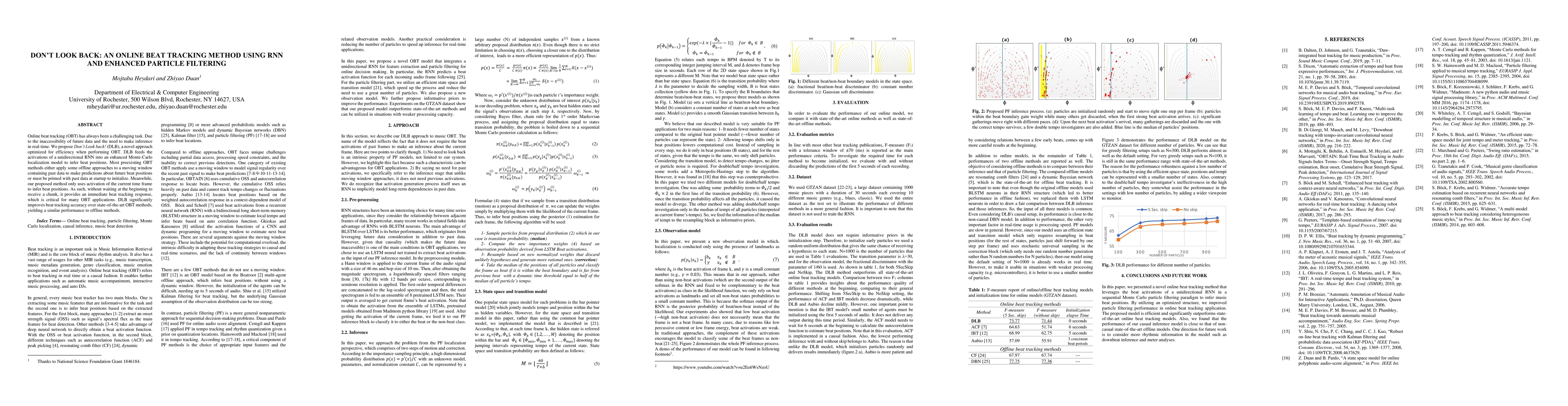 This paper introduces "Do not Look back!" (DLB), a novel online beat tracking method that leverages a unidirectional RNN and enhanced particle filtering to infer beat positions without relying on past data. DLB achieves immediate beat tracking responses, improving accuracy and efficiency compared to existing methods.