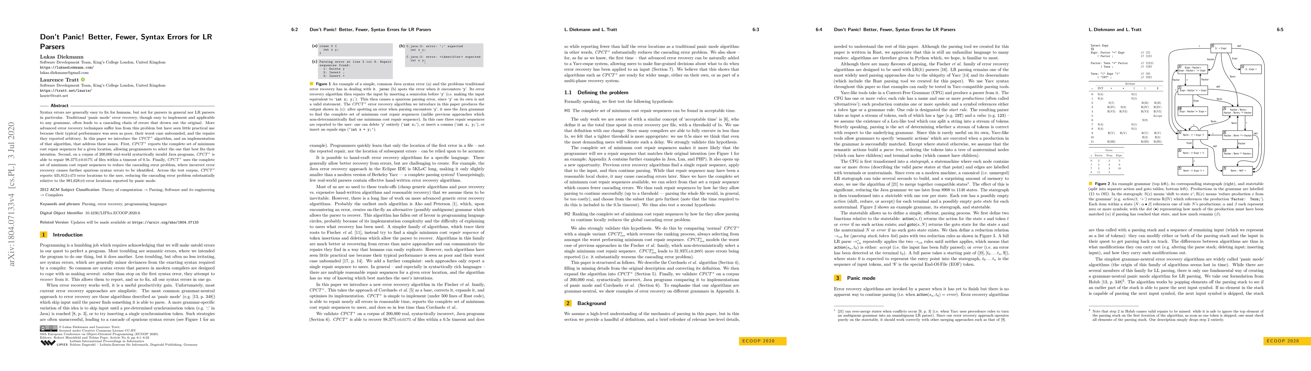 Syntax errors are generally easy to fix for humans, but not for parsers in general nor LR parsers in particular. Traditional 'panic mode' error recovery, though easy to implement and applicable to any grammar, often leads to a cascading chain of errors that drown out the original. More advanced error recovery techniques suffer less from this problem but have seen little practical use because their typical performance was seen as poor, their worst case unbounded, and the repairs they reported arbitrary. In this paper we introduce the CPCT+ algorithm, and an implementation of that algorithm, that address these issues. First, CPCT+ reports the complete set of minimum cost repair sequences for a given location, allowing programmers to select the one that best fits their intention. Second, on a corpus of 200,000 real-world syntactically invalid Java programs, CPCT+ is able to repair 98.37% of files within a timeout of 0.5s. Finally, CPCT+ uses the complete set of minimum cost repair sequences to reduce the cascading error problem, where incorrect error recovery causes further spurious syntax errors to be identified. Across the test corpus, CPCT+ reports 435,812 error locations to the user, reducing the cascading error problem substantially relative to the 981,628 error locations reported by panic mode.