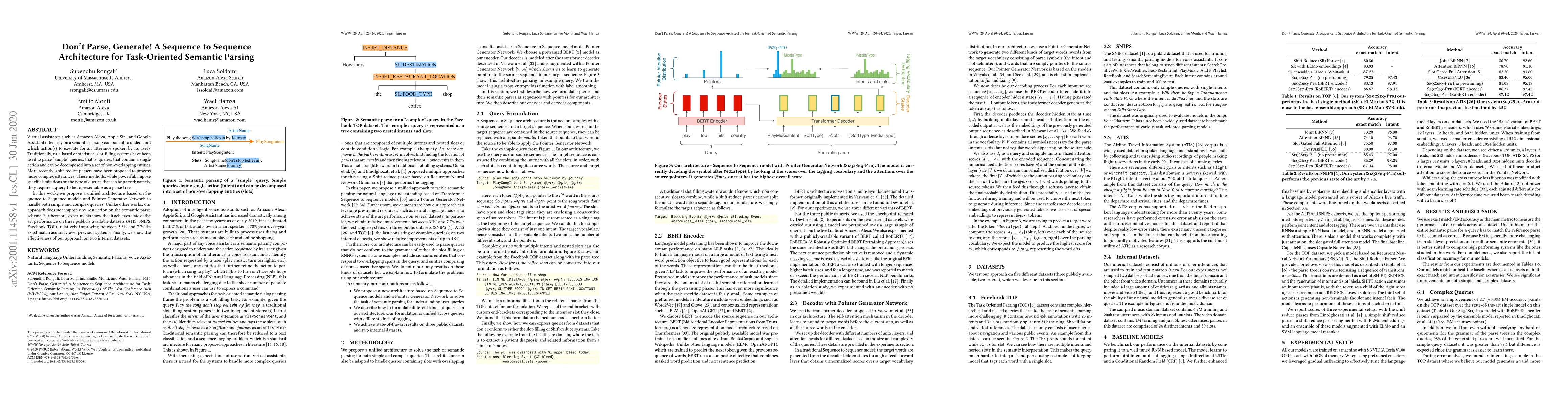 Virtual assistants such as Amazon Alexa, Apple Siri, and Google Assistant often rely on a semantic parsing component to understand which action(s) to execute for an utterance spoken by its users. Traditionally, rule-based or statistical slot-filling systems have been used to parse "simple" queries; that is, queries that contain a single action and can be decomposed into a set of non-overlapping entities. More recently, shift-reduce parsers have been proposed to process more complex utterances. These methods, while powerful, impose specific limitations on the type of queries that can be parsed; namely, they require a query to be representable as a parse tree. In this work, we propose a unified architecture based on Sequence to Sequence models and Pointer Generator Network to handle both simple and complex queries. Unlike other works, our approach does not impose any restriction on the semantic parse schema. Furthermore, experiments show that it achieves state of the art performance on three publicly available datasets (ATIS, SNIPS, Facebook TOP), relatively improving between 3.3% and 7.7% in exact match accuracy over previous systems. Finally, we show the effectiveness of our approach on two internal datasets.