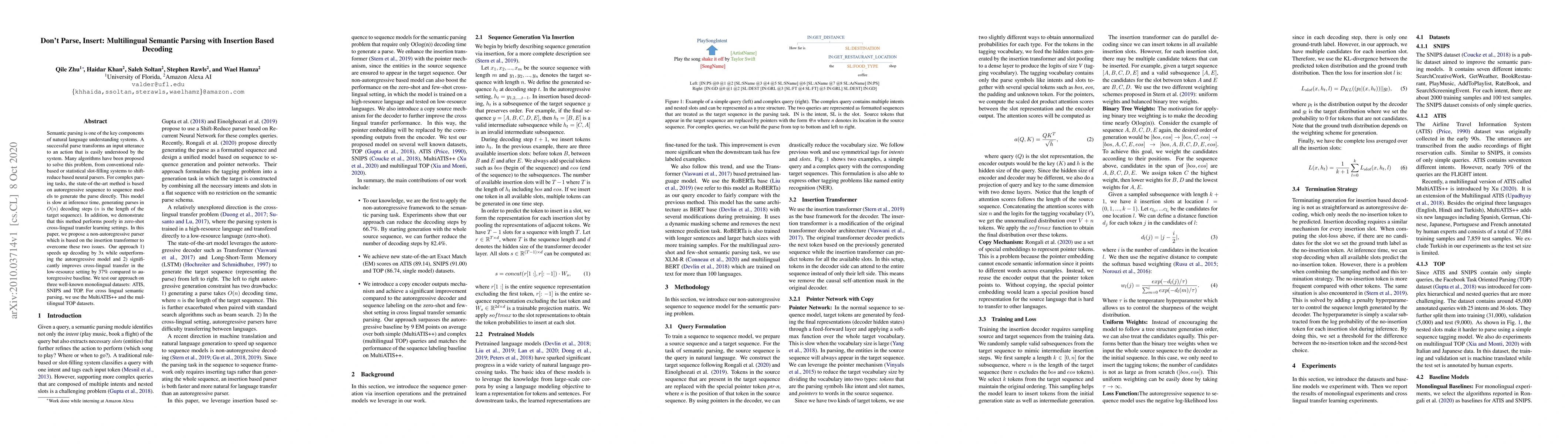 This paper proposes a non-autoregressive insertion transformer-based parser for multilingual semantic parsing, which speeds up decoding by 3x and improves zero-shot cross-lingual transfer by 37% compared to autoregressive models. The method is tested on several monolingual and multilingual datasets.