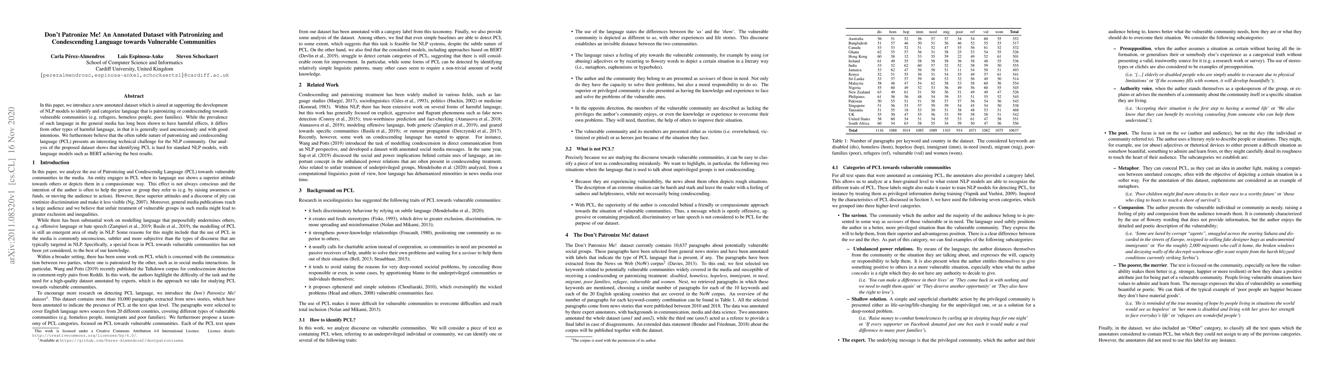 This paper presents an annotated dataset for identifying patronizing and condescending language towards vulnerable communities, aiming to support NLP model development. The analysis reveals that standard NLP models struggle with this task, but language models like BERT show promising results.