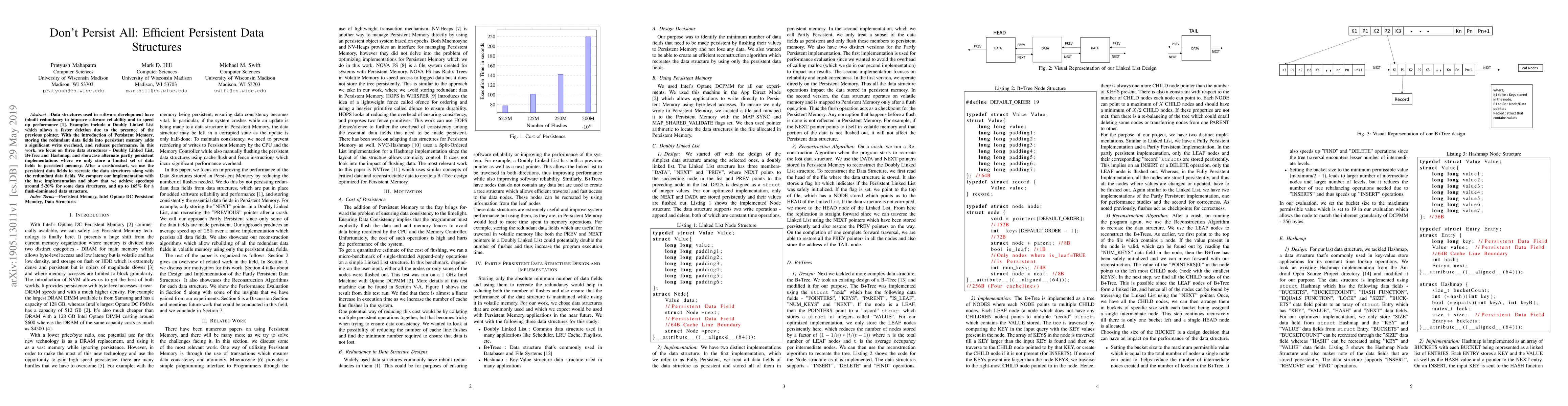 This paper explores efficient persistent data structures by selectively storing only necessary data fields in persistent memory, reducing write overhead and improving performance. The study demonstrates speedups of 5-20% for various data structures, with up to 165% improvement for flush-dominated structures.