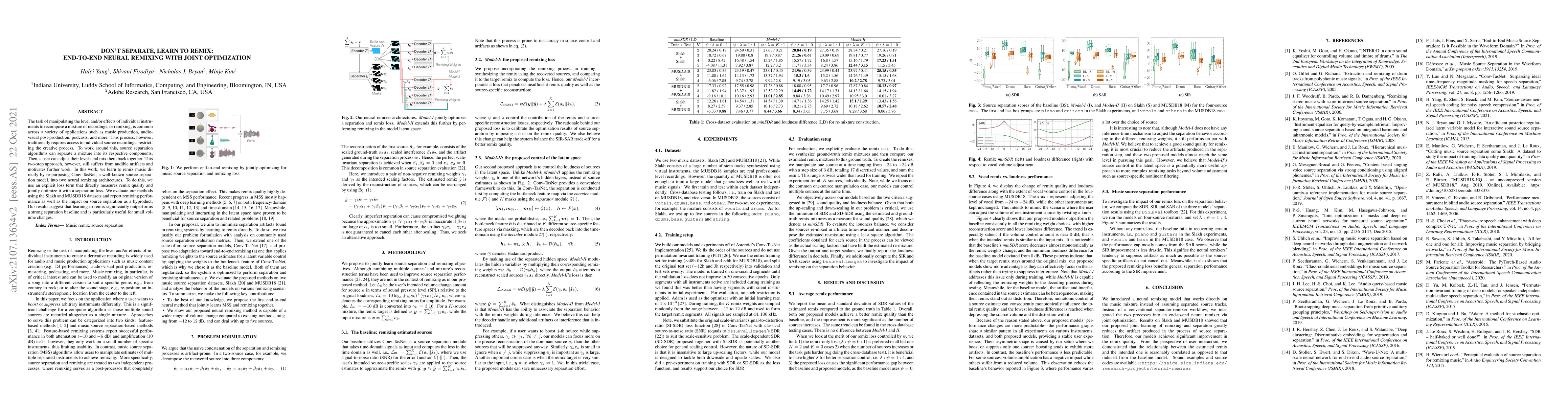 The task of manipulating the level and/or effects of individual instruments to recompose a mixture of recordings, or remixing, is common across a variety of applications such as music production, audio-visual post-production, podcasts, and more. This process, however, traditionally requires access to individual source recordings, restricting the creative process. To work around this, source separation algorithms can separate a mixture into its respective components. Then, a user can adjust their levels and mix them back together. This two-step approach, however, still suffers from audible artifacts and motivates further work. In this work, we learn to remix music directly by re-purposing Conv-TasNet, a well-known source separation model, into two neural remixing architectures. To do this, we use an explicit loss term that directly measures remix quality and jointly optimize it with a separation loss. We evaluate our methods using the Slakh and MUSDB18 datasets and report remixing performance as well as the impact on source separation as a byproduct. Our results suggest that learning-to-remix significantly outperforms a strong separation baseline and is particularly useful for small volume changes.