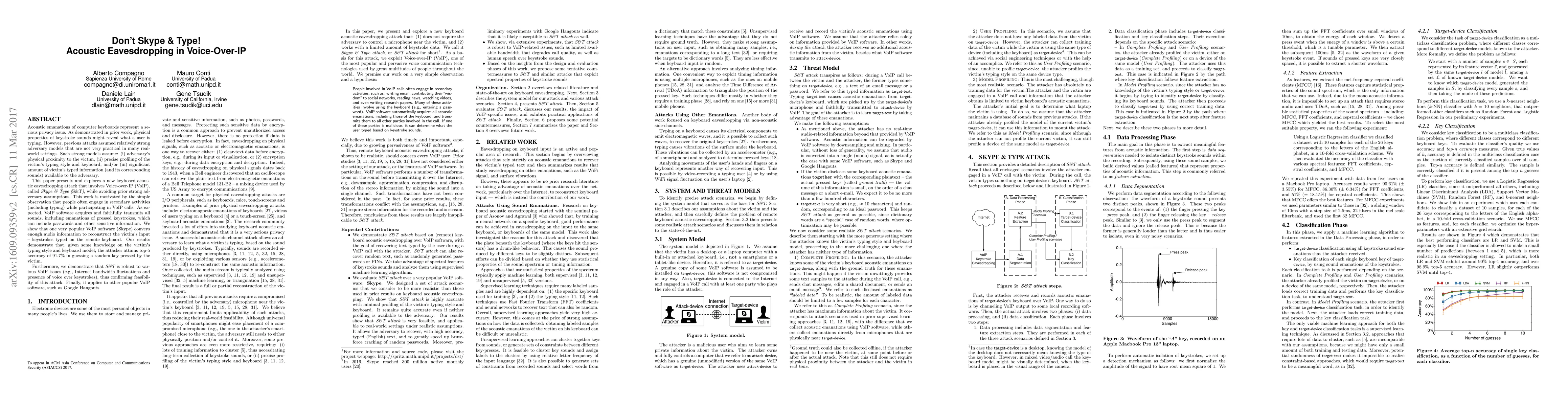 The paper introduces a novel keyboard acoustic eavesdropping attack, Skype & Type, which exploits VoIP to capture and analyze keyboard sounds for information disclosure, including sensitive data like passwords.