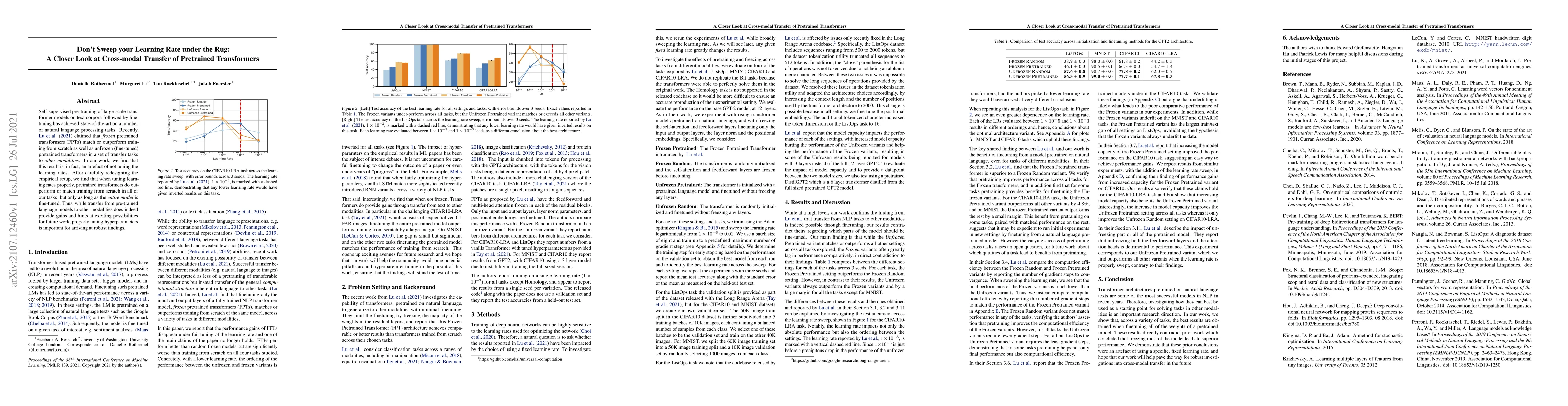 Pretrained transformers outperform training from scratch when learning rates are properly tuned, but only when the entire model is finetuned. Properly tuning hyperparameters is crucial for robust findings in cross-modal transfer tasks.