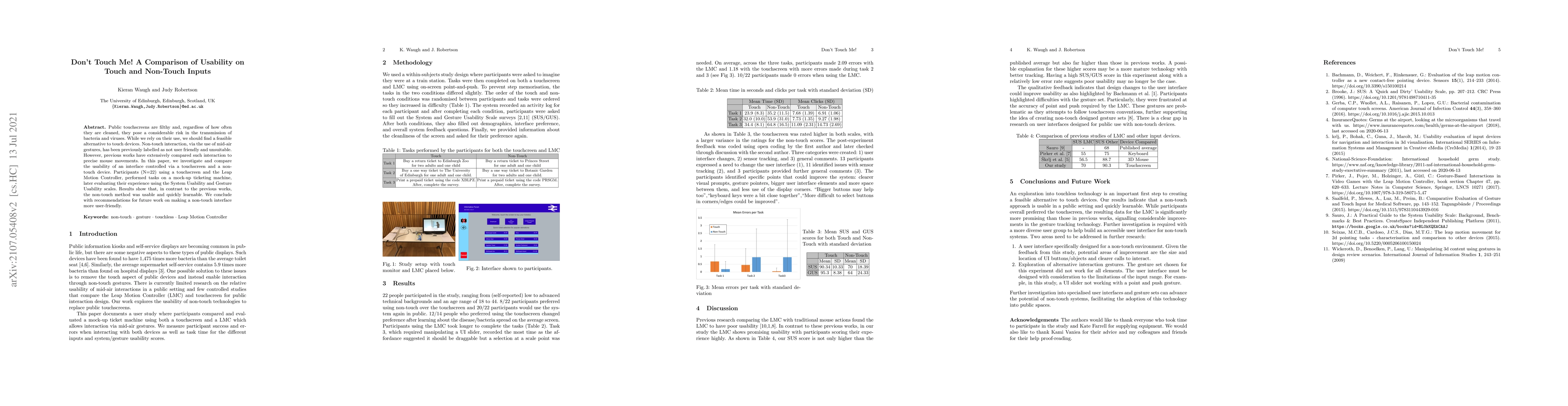 This study compares the usability of touchscreens versus a non-touch interface using mid-air gestures from the Leap Motion Controller. Contrary to previous claims, the non-touch method proved to be usable and quickly learnable, suggesting potential for safer, more hygienic interaction alternatives.