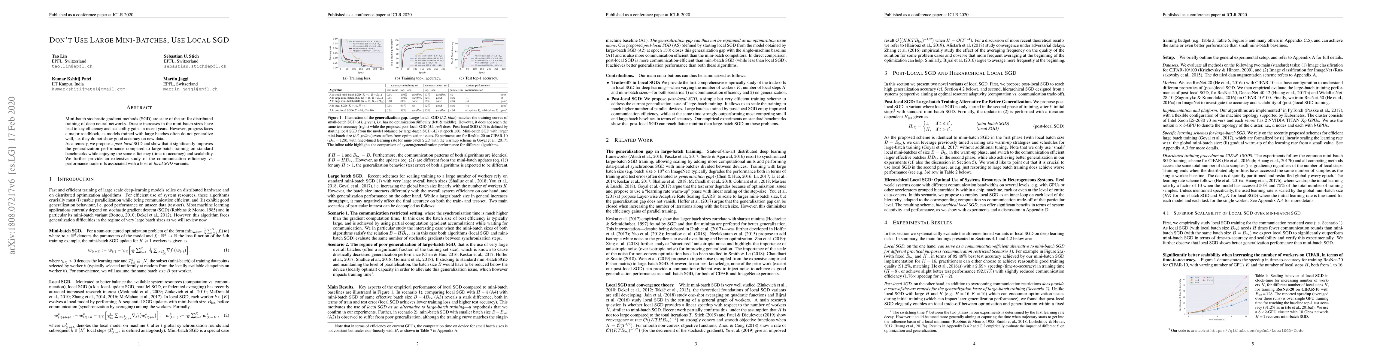 Mini-batch stochastic gradient methods (SGD) are state of the art for distributed training of deep neural networks. Drastic increases in the mini-batch sizes have lead to key efficiency and scalability gains in recent years. However, progress faces a major roadblock, as models trained with large batches often do not generalize well, i.e. they do not show good accuracy on new data. As a remedy, we propose a \emph{post-local} SGD and show that it significantly improves the generalization performance compared to large-batch training on standard benchmarks while enjoying the same efficiency (time-to-accuracy) and scalability. We further provide an extensive study of the communication efficiency vs. performance trade-offs associated with a host of \emph{local SGD} variants.